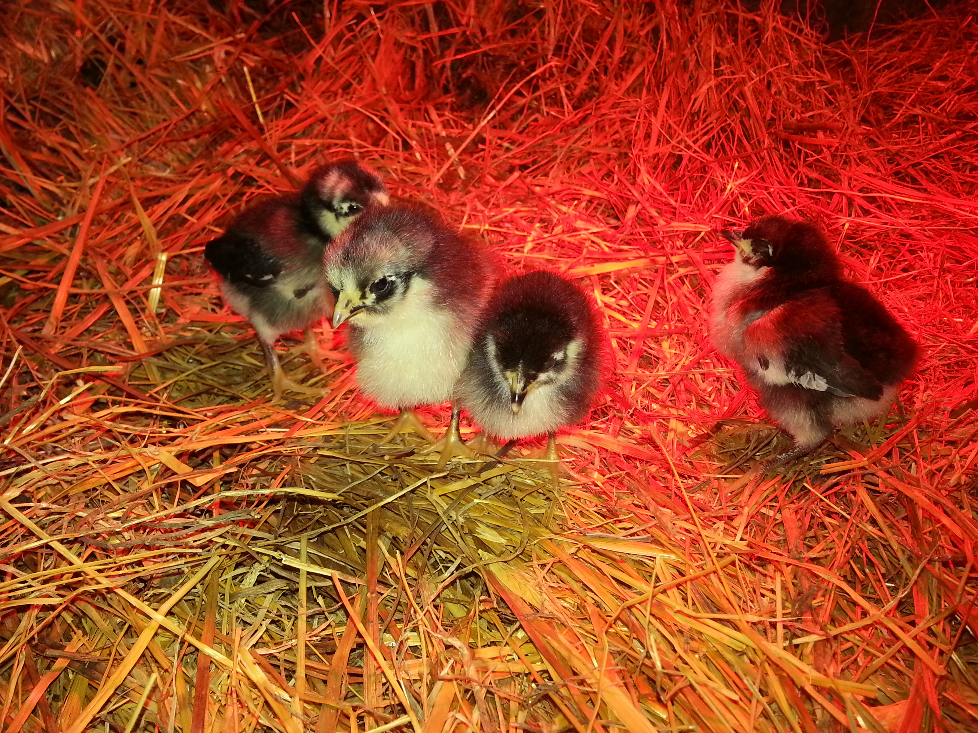 The day-old chicks arrived at the store in a box delivered by U.S. mail.  While I had ordered only half-a-dozen specialty breed pullets, they came boxed with two dozen unsexed White Leghorns for cushioning and warmth.  I had hung a heat lamp—a warm if impersonal surrogate for their mothers’ downy breasts—in a makeshift pen because the chicks were too tiny and frail to generate enough of their own body heat against the chilly Spring nights.  The hanging lamp radiated light and heat downward to make a spot of warmth in the straw where the chicks gathered close to rest.  I don’t think they ever fully slept, for the light.  But they were warm and safe and comfortable.