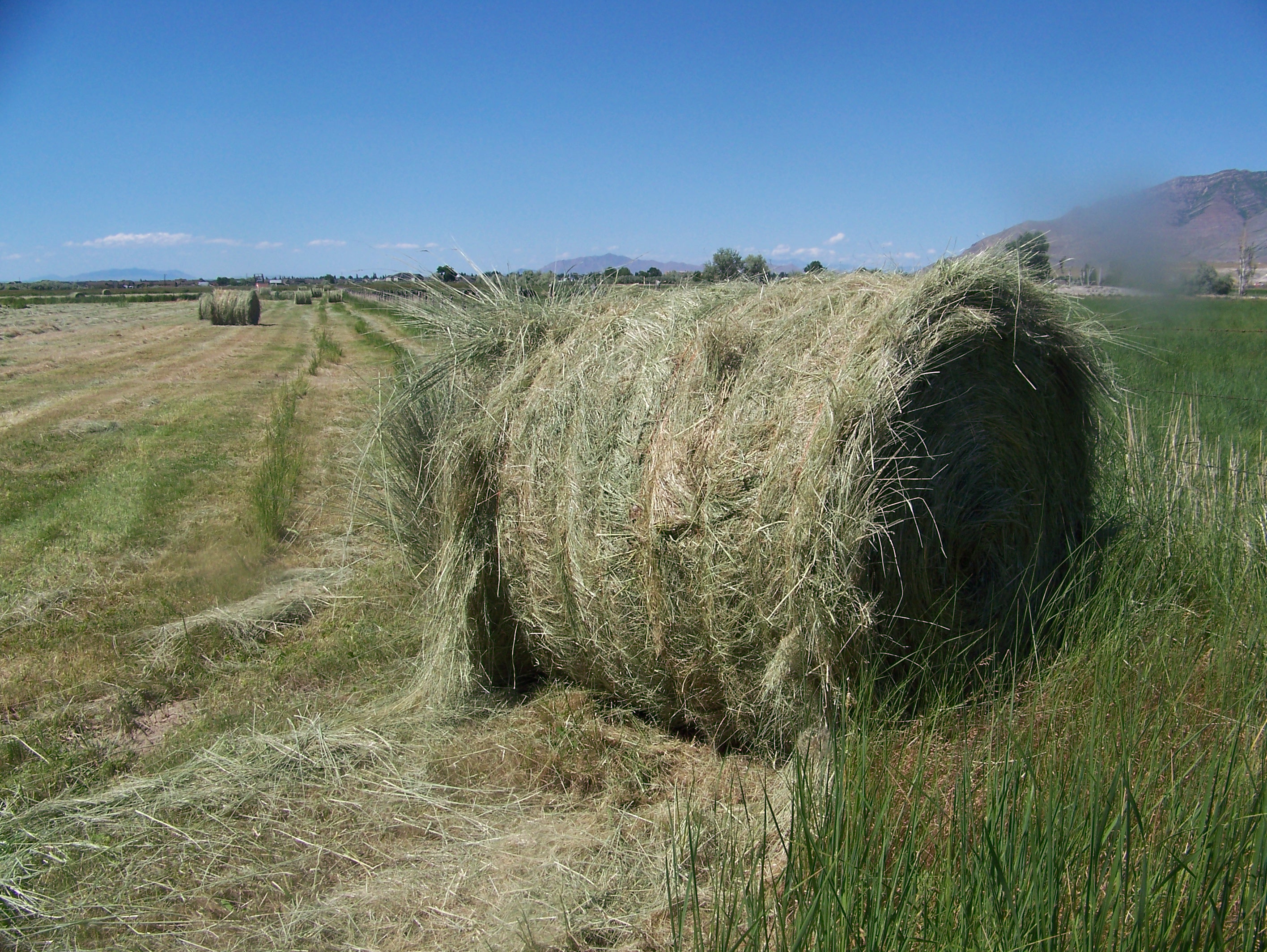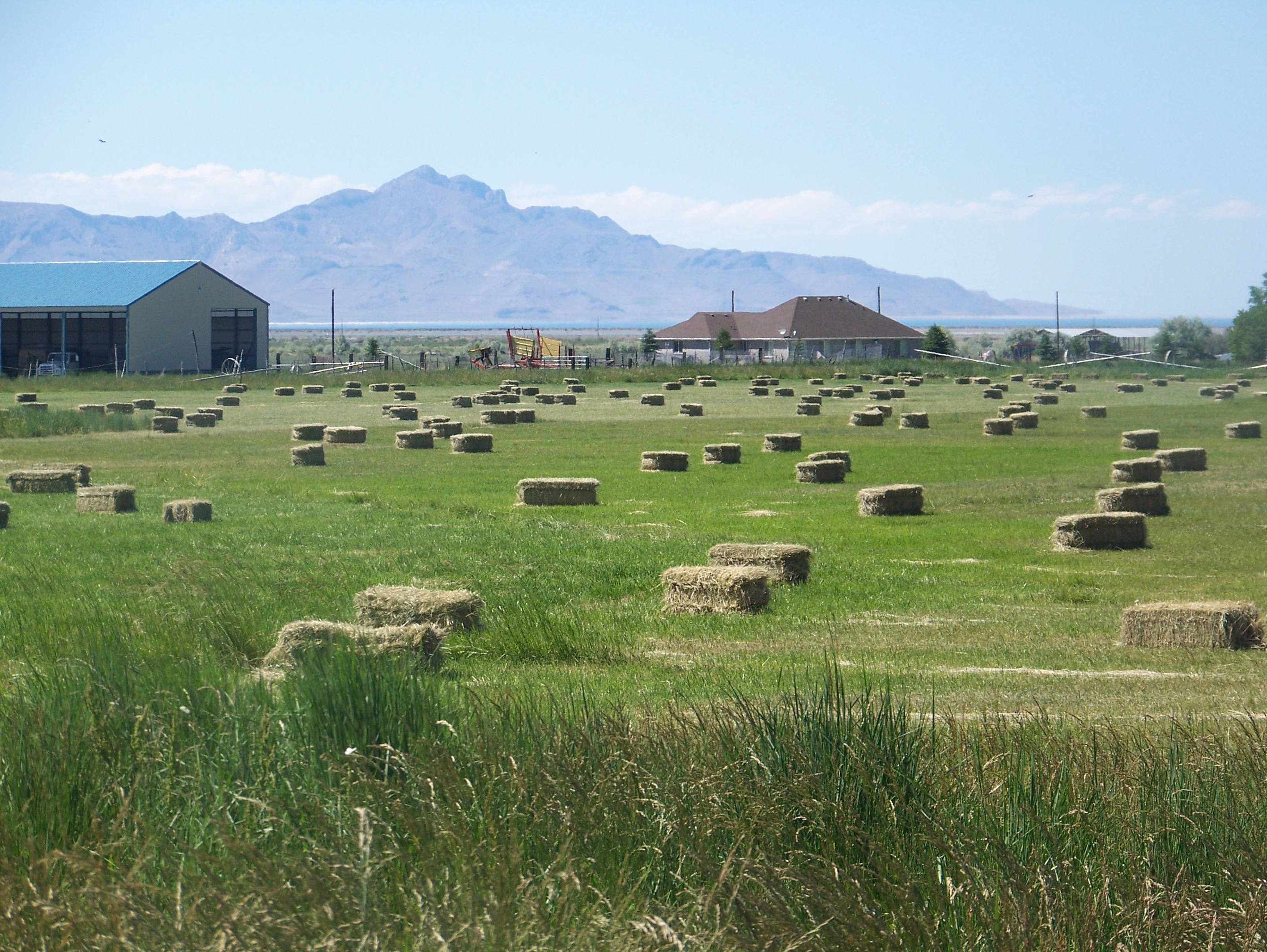 Erda farmers pray anxiously for the sparse rains, except during the three or four alfalfa harvests of the year, when they pray for blue skies.  A poorly timed rain (or rather, a poorly timed harvest), can ruin the drying hay.  The water quickly leaches out the nutrients and leaves the rows of hay a mildewing mess.  Once the hay is baled and stacked, rain can do them little harm.