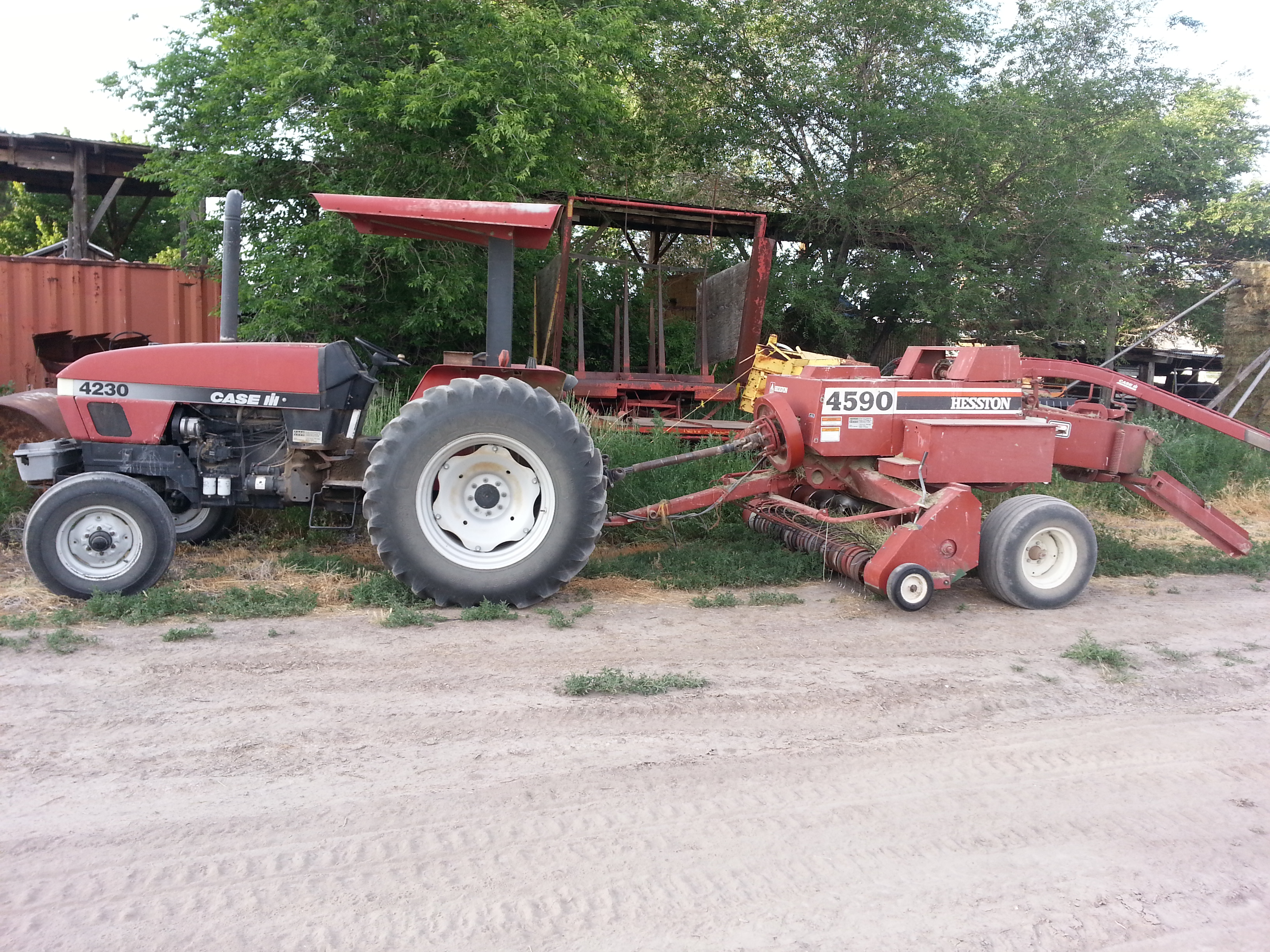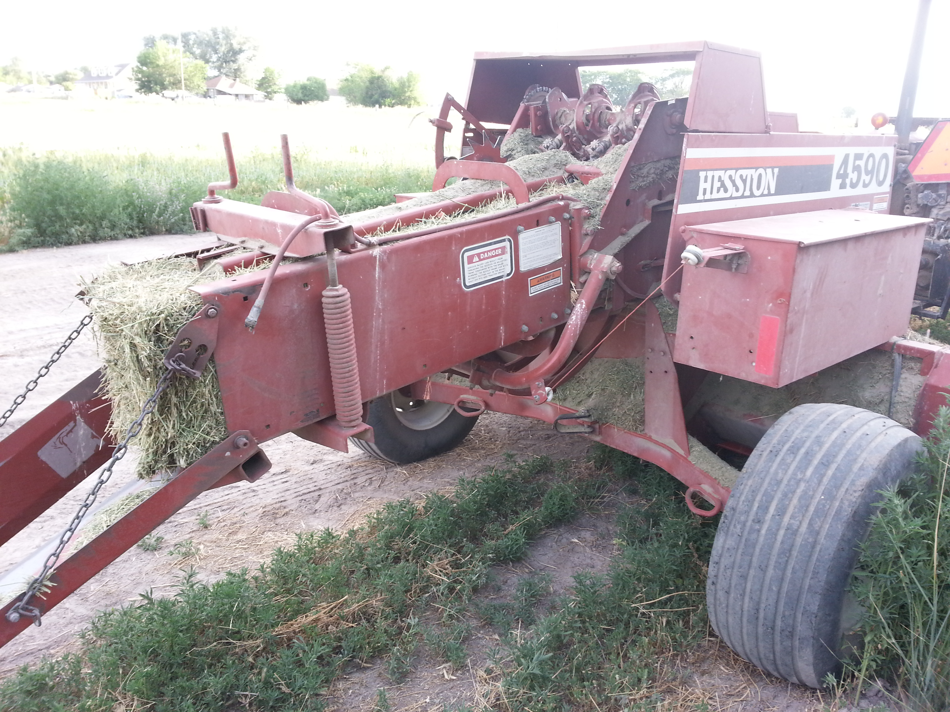 The same rakes are used to turn the cuttings over to thoroughly dry in the summer sun.  The cuttings must be fully dried out before baling, or mold will grow inside the tight bales, making them unfit for feeding to horses.  When the plant has fully dried, another tractor pulls a baler, which gathers up the tangled stems and leaves and binds them tightly with nylon twine, yellow, orange, or red, into rectangular bales about three feet long and one-foot tall and deep.  Thirty bales make a ton.