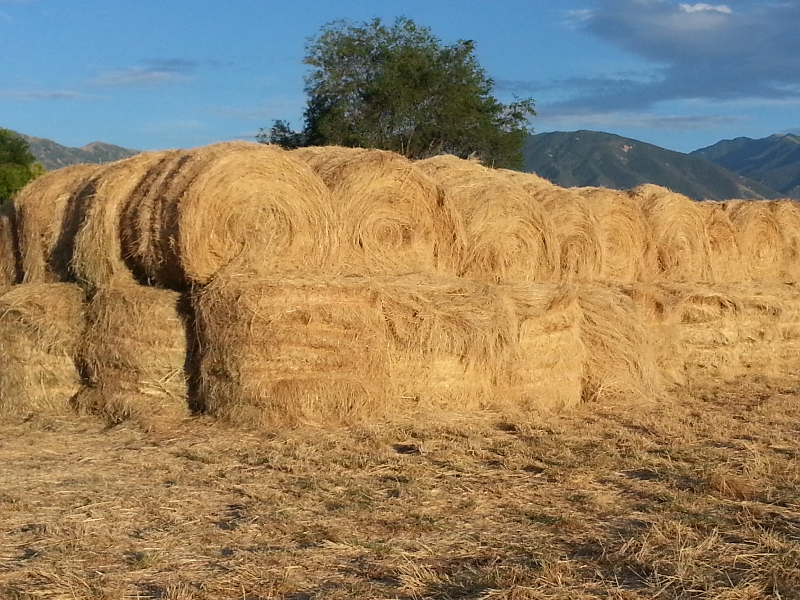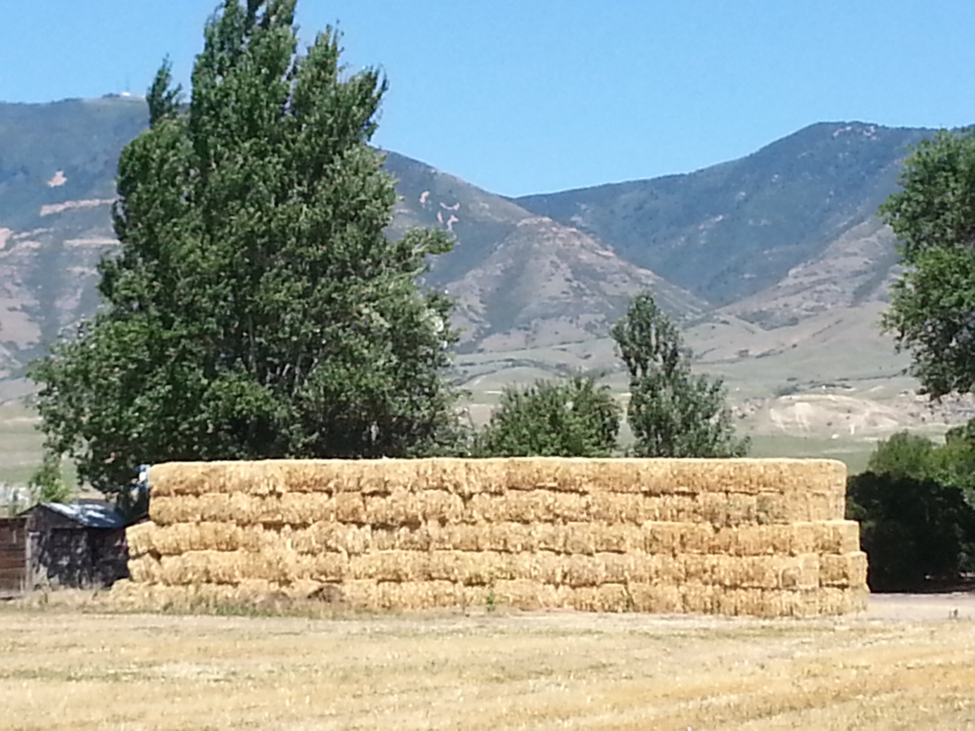 Before moving to Erda, I thought that straw and hay were two words used to describe the same substance.  Perhaps hay was the green living stuff, while straw was the cut, dried, baled, and stacked stuff.  Just different forms of the same item, like cow and beef.  I soon learned how wrong I had been.  Straw is, in fact, the harvested stalks of grain plants, especially oats.  It is generally used for animal bedding, not animal food.  Huge harvesters separate the grains from the reedy stalks, which stalks are cut and fed into a baler and bound tightly into bales.  Enormous clouds of dust follow the harvesters as they glean out the grain and chop down the stalks, also called chaff.