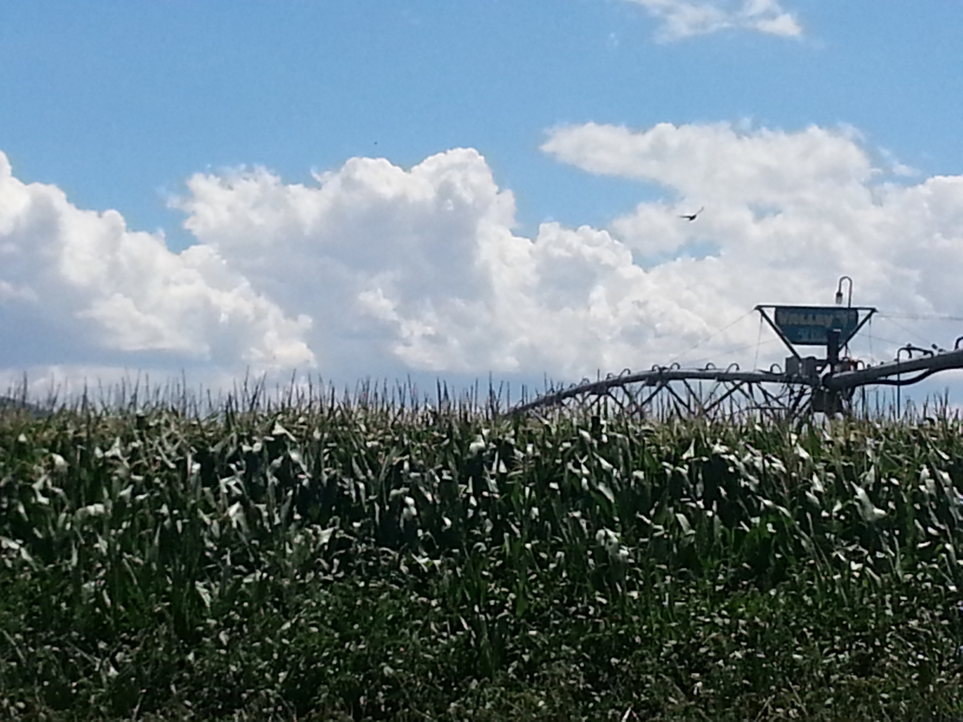 The most modern irrigation method is the pivot.  A pivot consists of an elevated pipe suspended on a metal superstructure mounted on rubber wheels.  The sprinklers hang down from the pipes, spraying mist directly onto the crops.  A motor at the pivot point slowly swings the pivot around in an arcing circle, irrigating 60 or more acres without any human intervention beyond turning the water on and off.  The corners of the fields still need to be sprinkled manually.