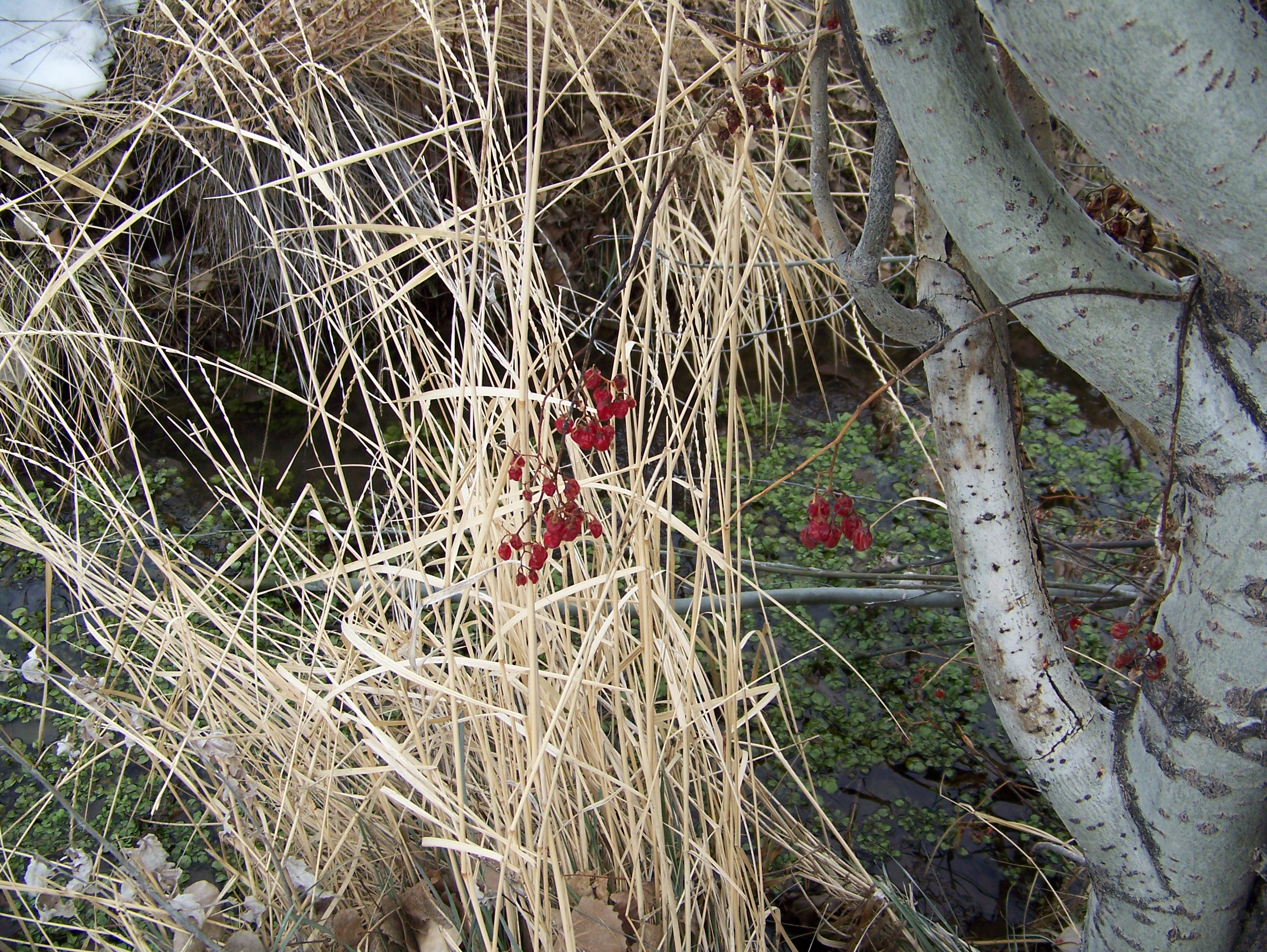 Virginia Creeper vines climb through the Russian Olive trees, scarlet serrated leaves mixing with powdery olive-white. In late Autumn, the red leaves fall to line the weed-choked ditch, like red confetti in the gutter the morning after a parade.