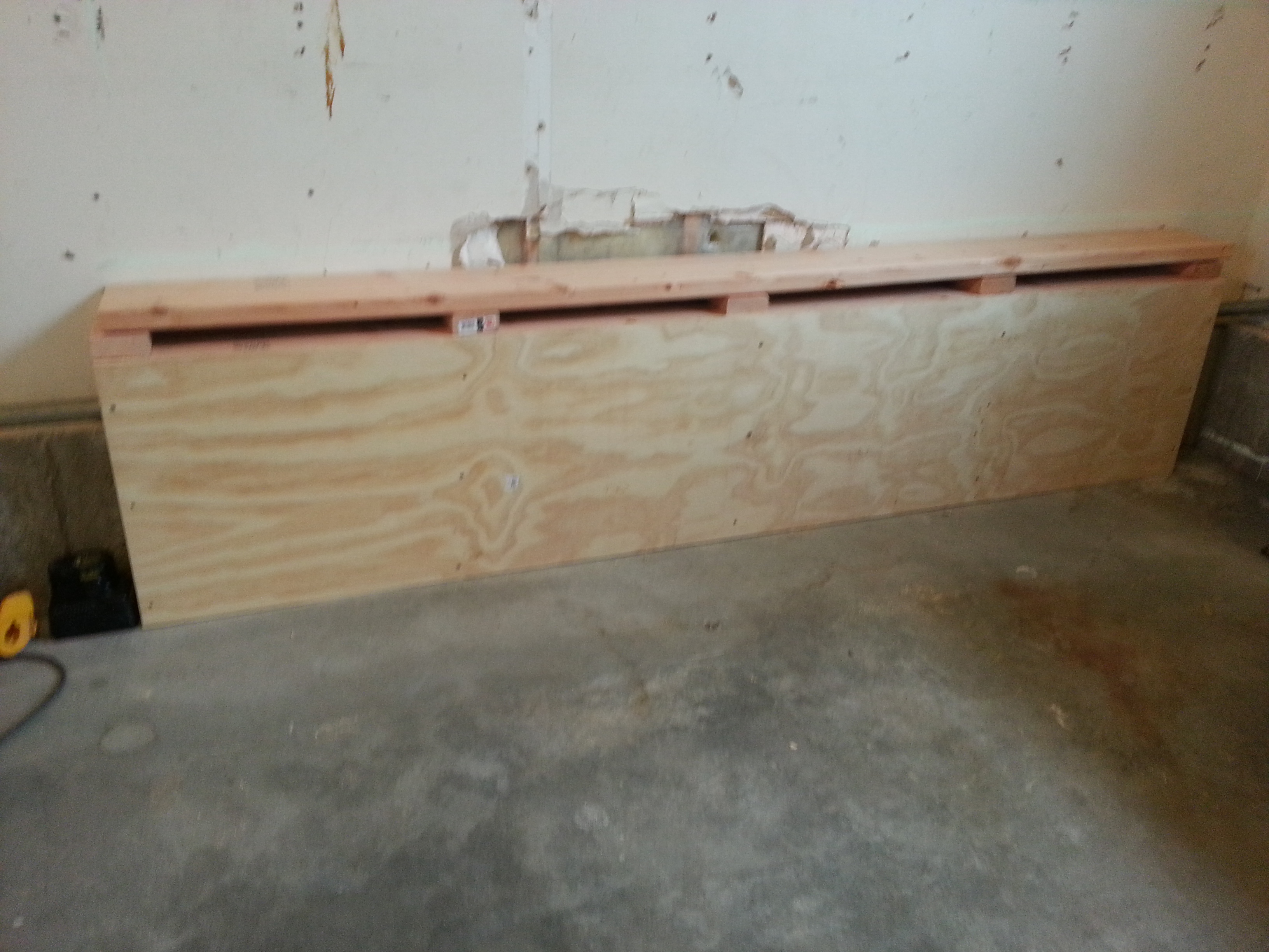 We carefully drew out our plans, bought the materials, and got to work.  The first step was to assemble a kick plate and wall foundation to attach to and cover the garage footing.