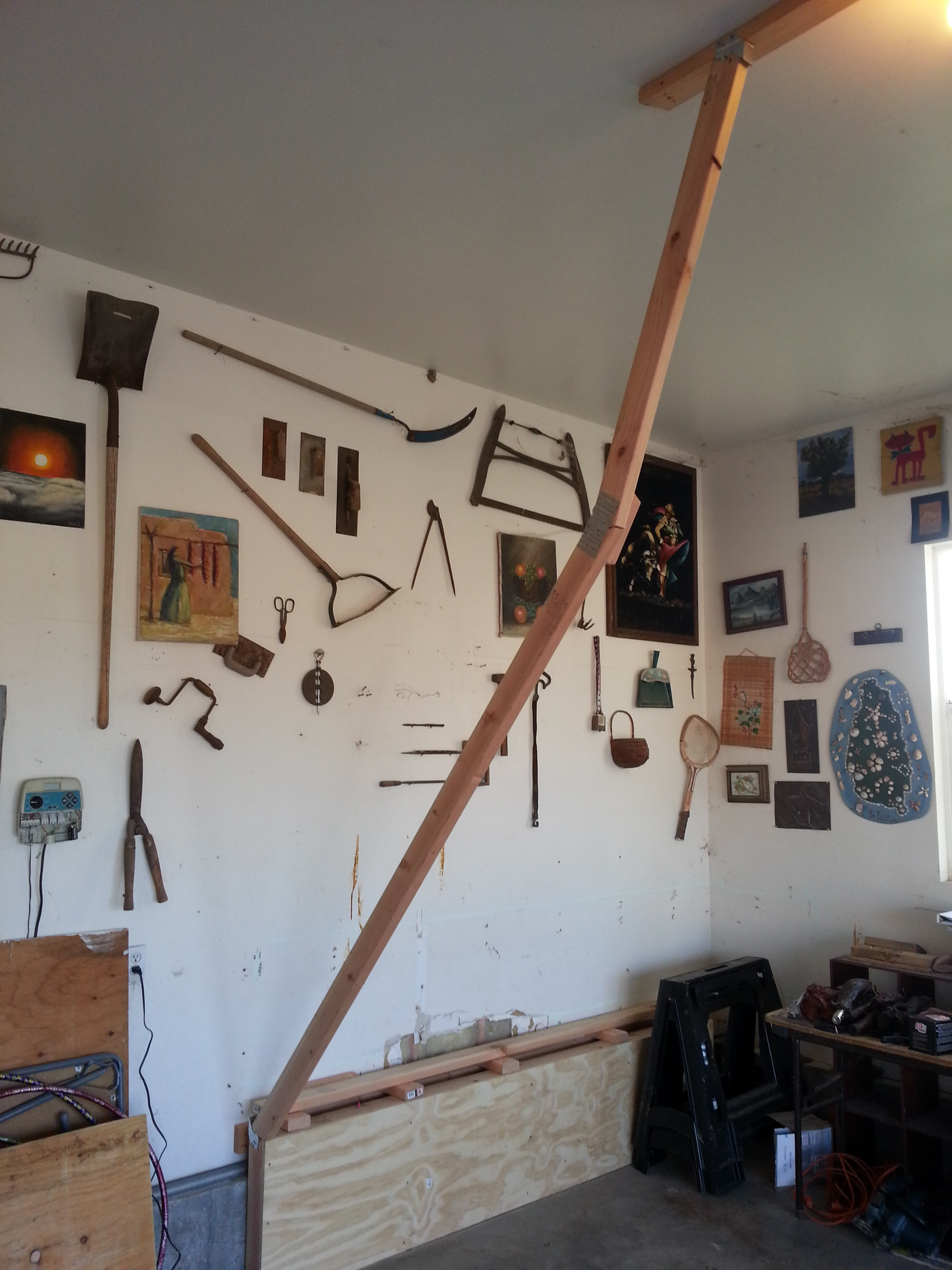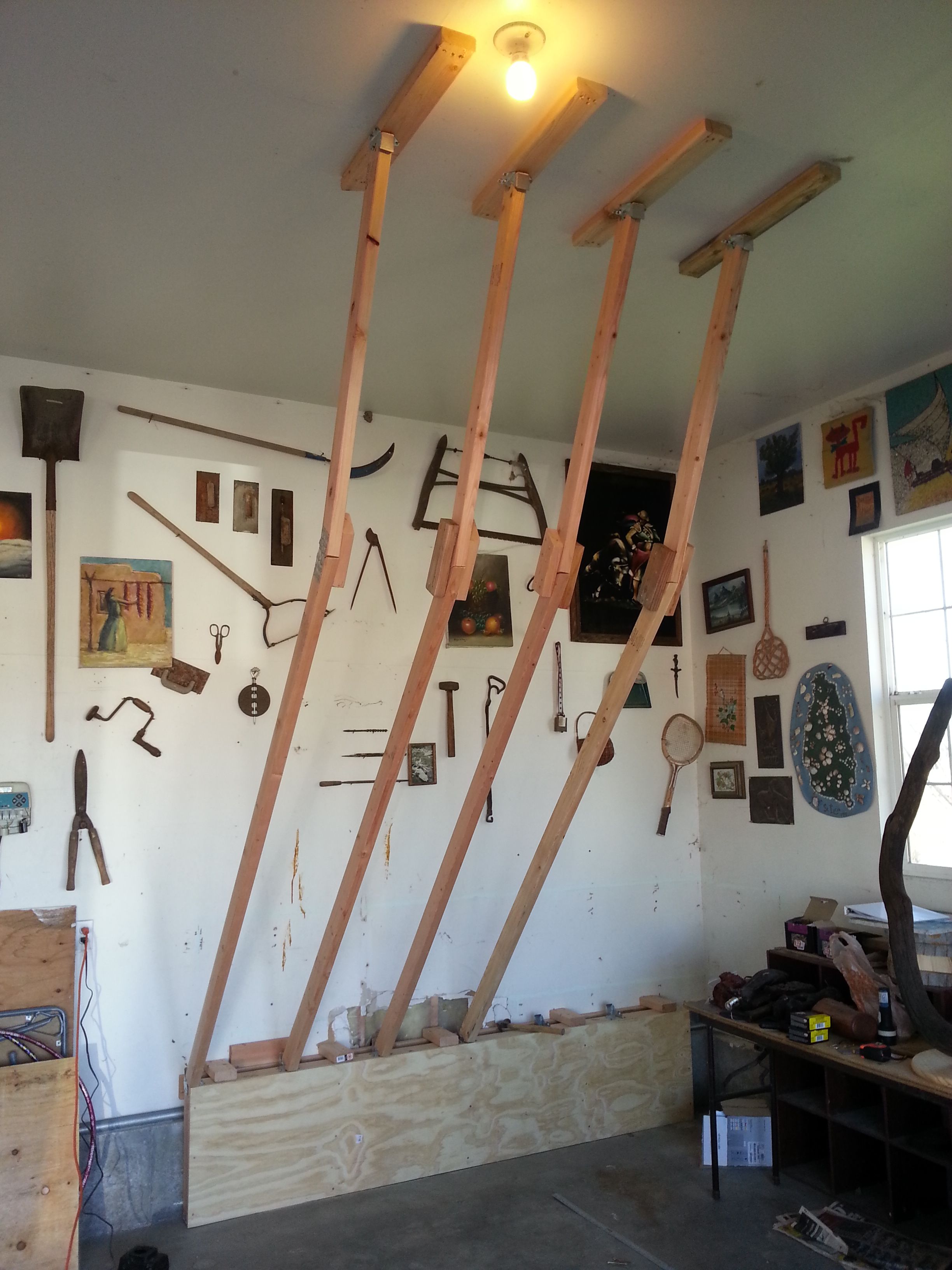 My good friend Paul (who is an engineer) instructed me that roof trusses are designed to withstand snow loads bearing down from above, not weight pulling down from below.  So I climbed up into the garage attic, crawled through fiberglass, and braced the roof trusses with 2x4s.  We also insert a portable vertical 4×4 post whenever anyone climbers, just to be sure the roof won’t fall in on the climbers.