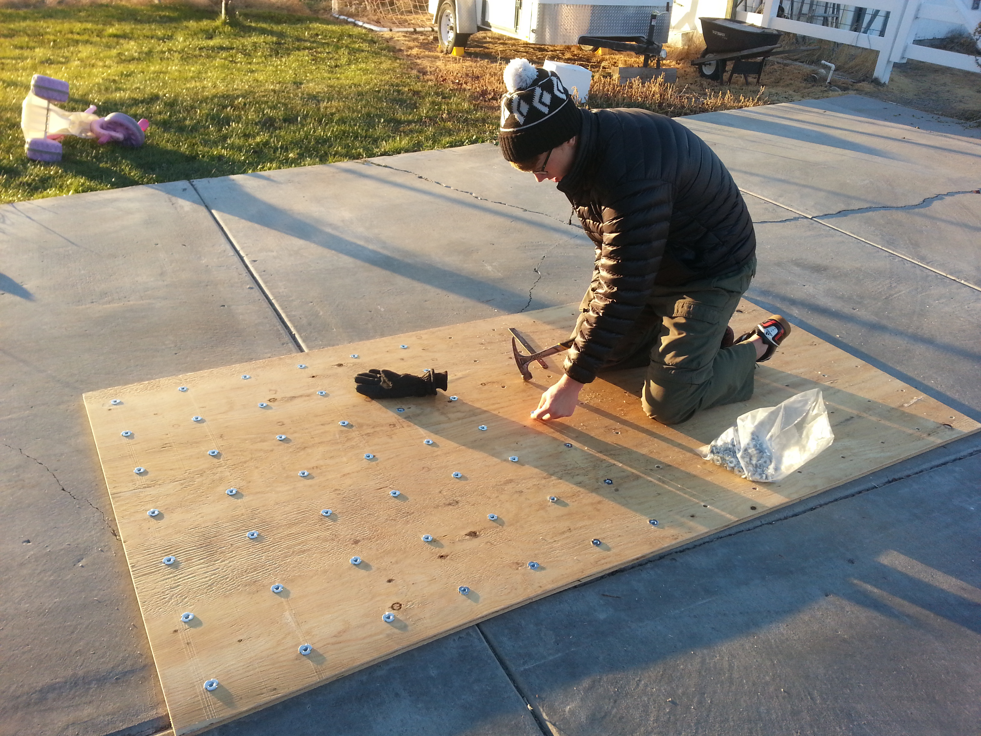 Next came assembling the climbing wall surface.  Before we mounted the 3/4-inch plywood, John drilled numerous holes and inserted threaded T-nuts, into which the climbing hold would later be secured.