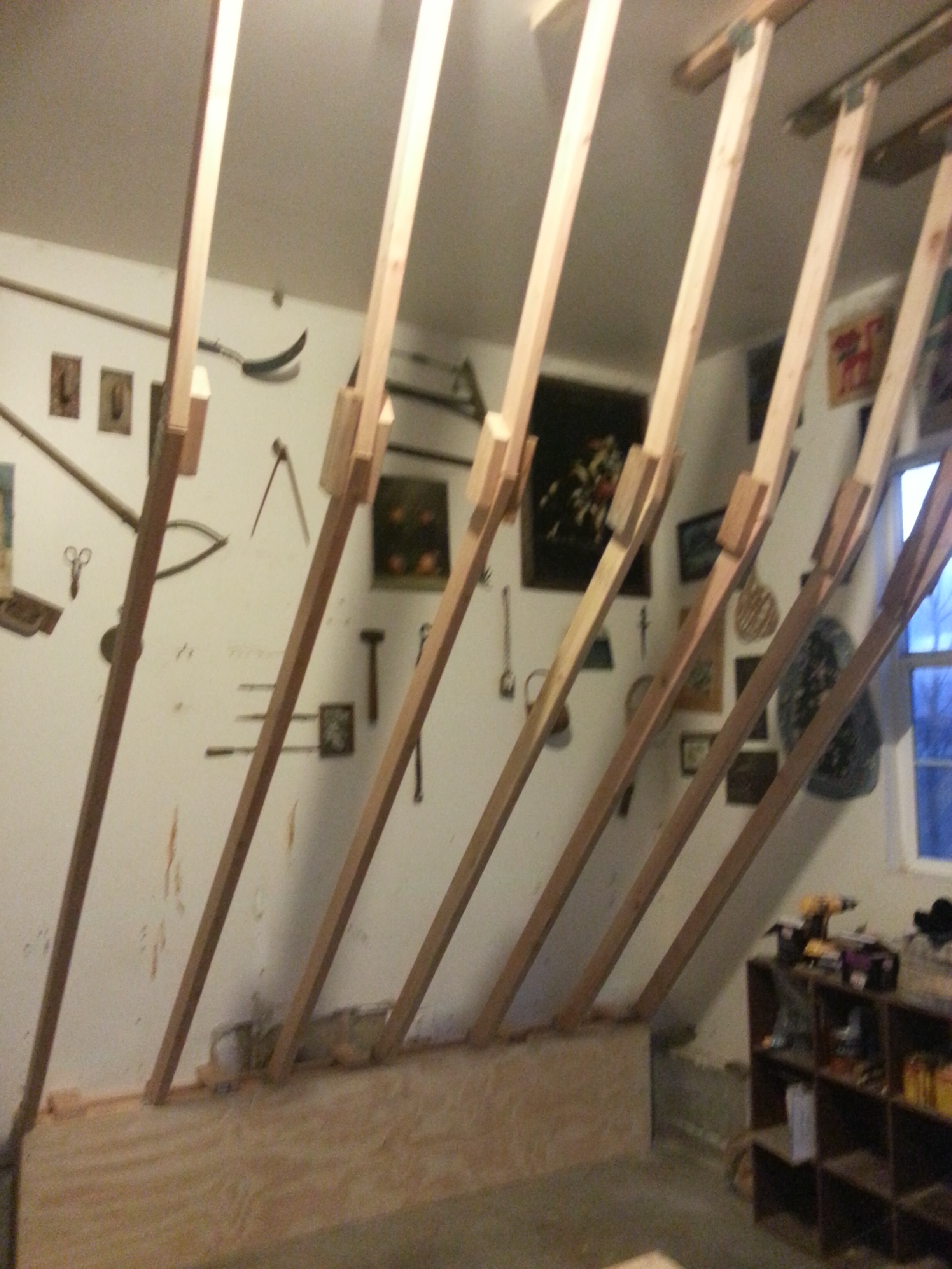 The angled joists were also secured to ceiling braces, screwed into the garage roof trusses.
