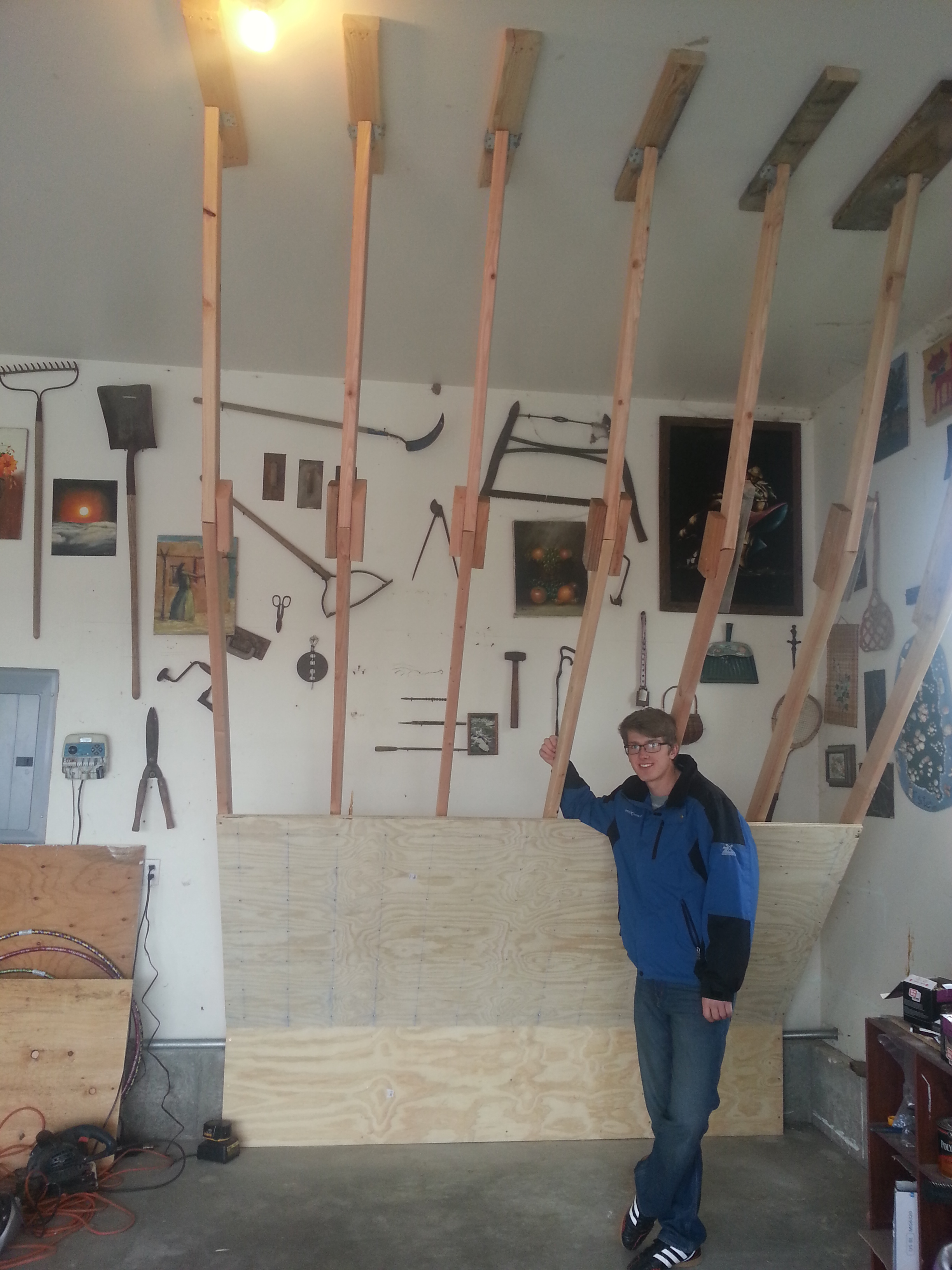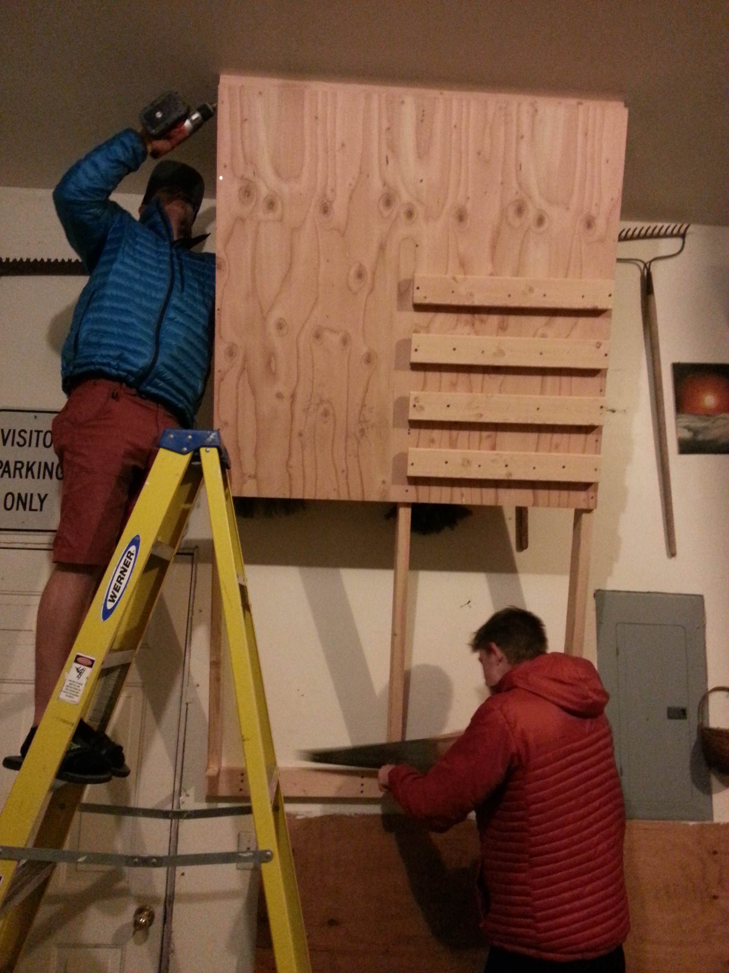 The week before Christmas 2015, Caleb (16, also a taekwondo blackbelt and climbing enthusiast) whispered to me that he wanted to add to John’s climbing wall by building a “campus board” as a Christmas present for his brother John (now 18).  (Another sigh from dad.)  A campus board is an angleled wall with horizontal rungs cut for hanging and climbing, to strengthen the fingers, hands, and indeed the whole upper body.  Caleb designed it, and we set to work.