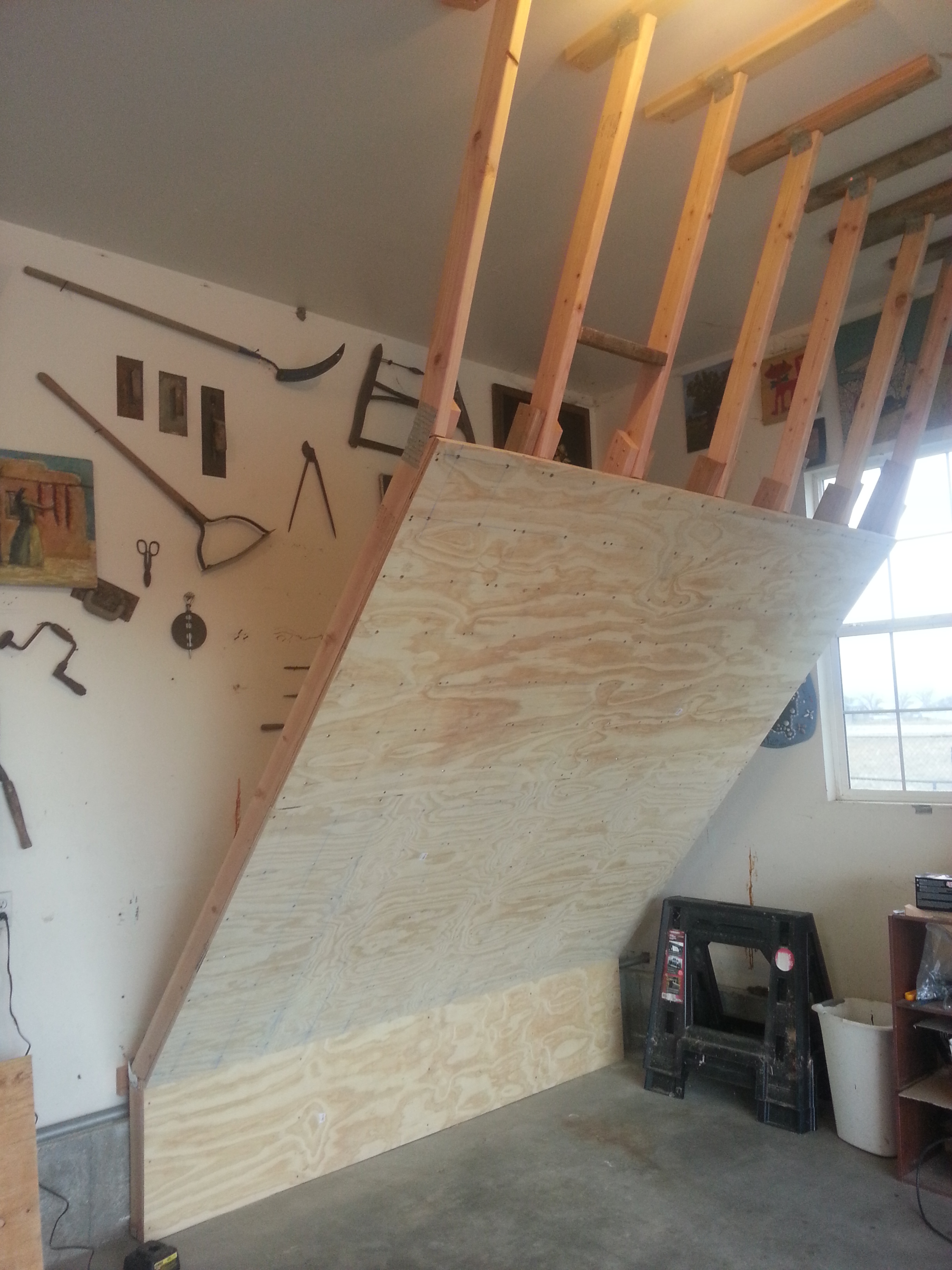 The angled joists rest firmly on the kick plate/foundation wall, bearing much of the climbing wall’s weight.  This low wall is also where the climbing starts, with the climber in a sitting position.