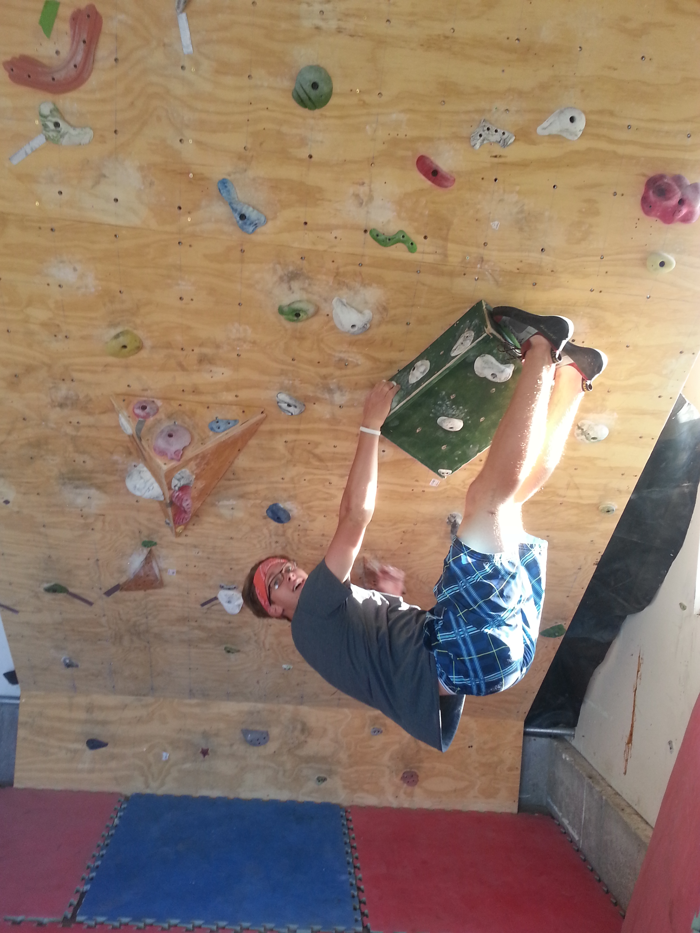 Note the crash pads underneath the climber.  Crash pads are mandatory.  These are surplus martial arts mats, to which we add several foam sleeping pads.  (John is a third-degree taekwondo blackbelt.)