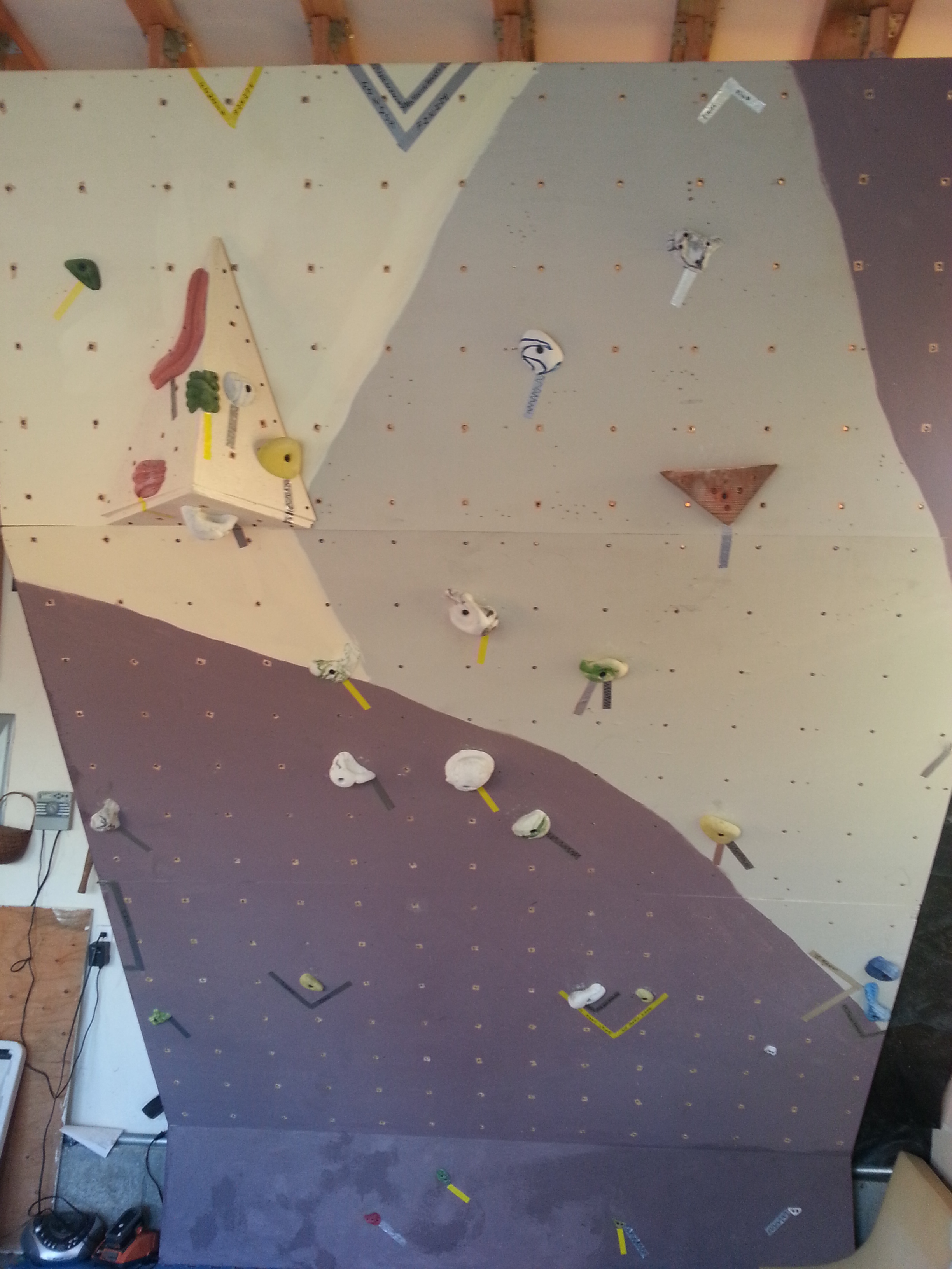 Weeks later, John removed all the holds and painted his climbing wall, adding sand to the paint to add texture to the wall.  He used paint scraps left over from previous house painting projects.  Tapes of various colors mark the different bouldering “problems” or routes.