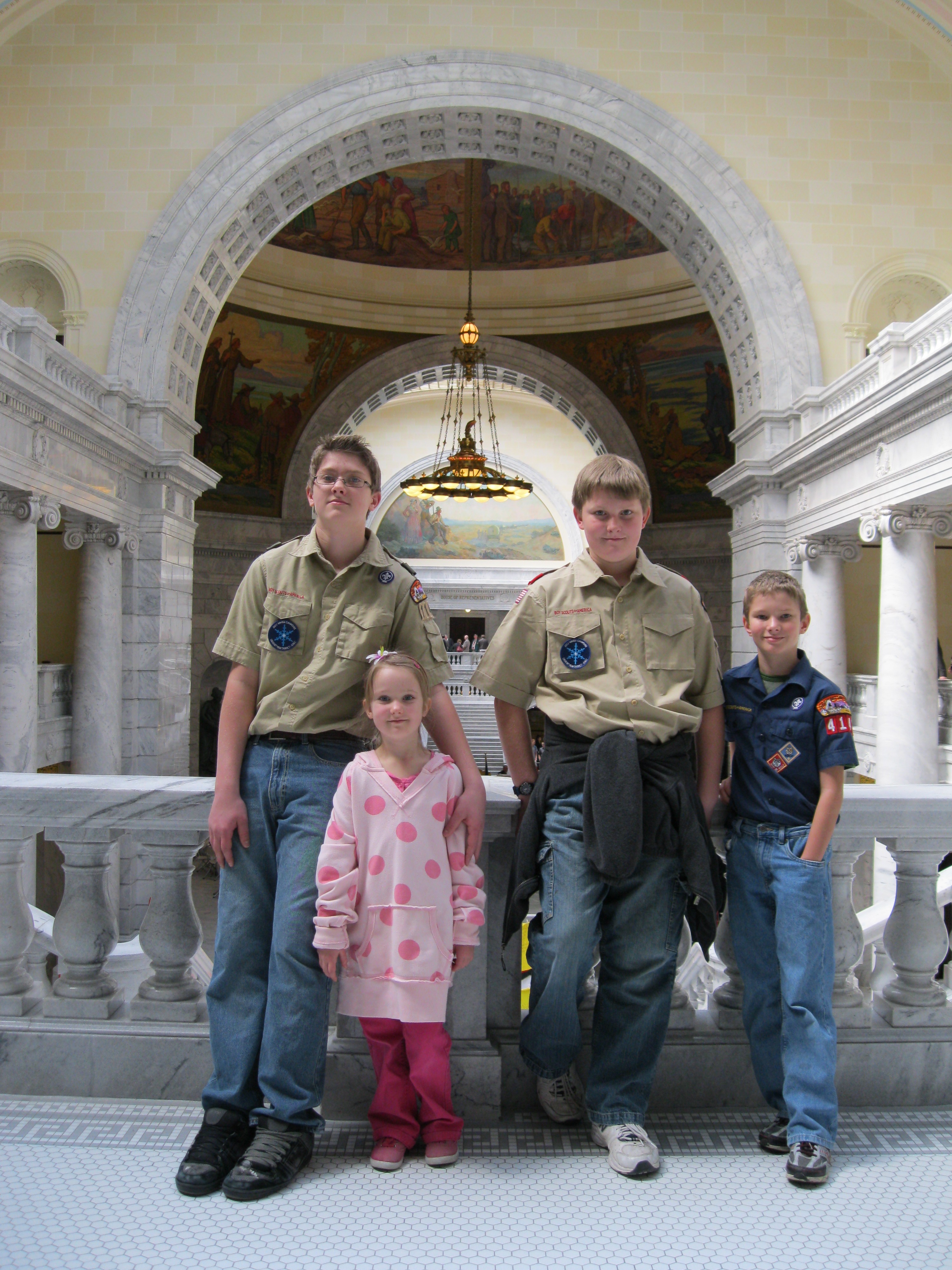 John (13), Caleb (12), Hyrum (9), and Hannah (5) in the Utah State Capitol building