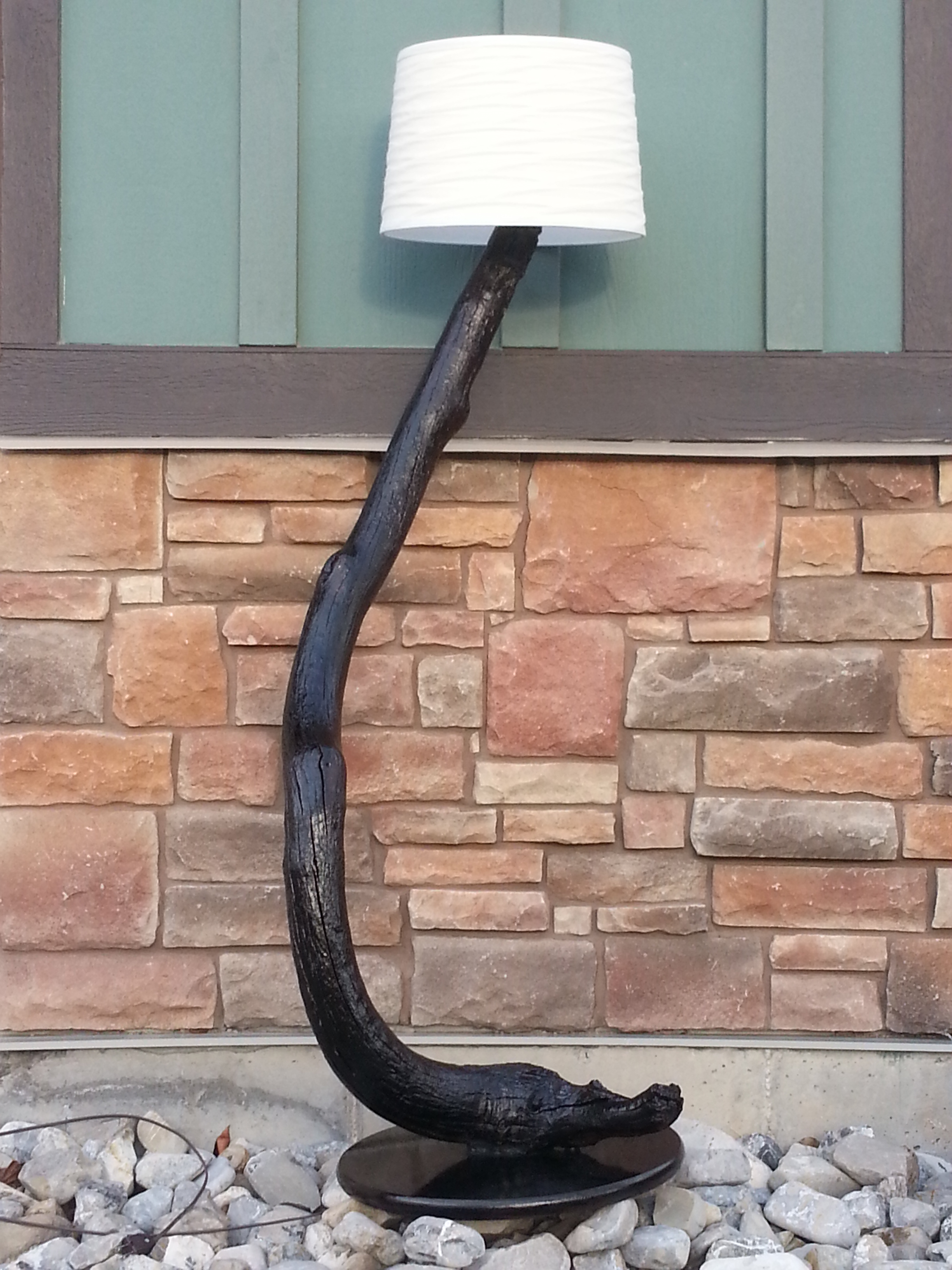 This lamp posed the special challenge of mounting its lithe and twisting form to the base. At first I used a single nut and bolt, with washers at each end. But no matter how tight, the lamp still wobbled. Eventually, after staining and wiring, I added another bolt, and the lamp now stands firm like a ship’s mast to a ship. While drilling such a lamp for wire would normally be a challenge, only minimal drilling was required. The wire follows mostly natural cracks running down the back of the wood.