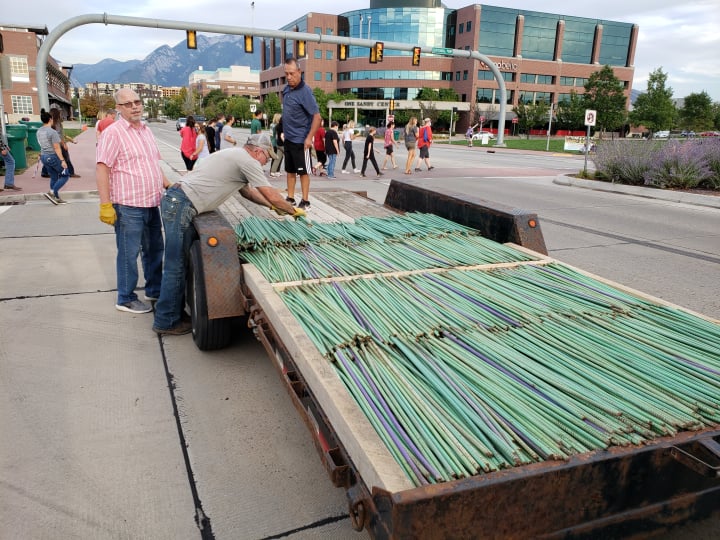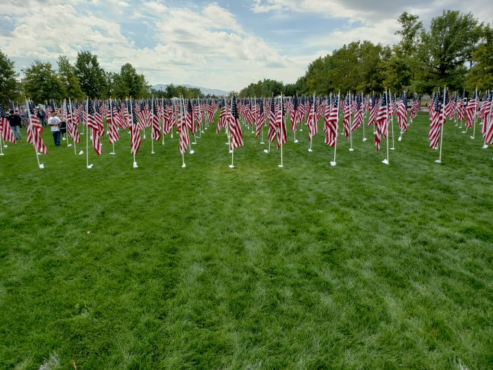 I was in a hotel elevator, at a conference on domestic violence prosecution, in Provo, Utah, when I learned of the attacks on the Twin Towers. The scheduled speakers yielded to the television screens as we watched, stunned and horrified.  Twenty years later, I walked amidst 2,977 American flags planted in a field, a Healing Field, in my new residence city of Sandy.  Each flag had a tag with a name and a story of where he worked, how she was loved by family and friends, what their hobbies were, their age, their loved ones, and the location of their death: World Trade Center; Pentagon; Flight 93 in a Pennsylvania field near Shanksville.  I read a hundred or so tags on flags flying for the people who died on 9/11/2001.  I had dressed in a jacket and tie, thinking it fitting.  The next day I drove Mom and Dad slowly around the field, twice, because they couldn’t walk, but they wanted to see, they wanted to honor, and I told them about the persons I had read about—the Flight 93 pilot, the World Trade Center trader, the Pentagon general, the child traveling with her mother, the secretary, the cook.  And the next day I descended on the field with 300 other volunteers to remove the tags, roll up the flags, and yank the three-foot rebar from the ground, one each for 2,977 persons, including 411 first responders, whom we have promised to always remember.  I rolled flags and yanked rebar with people aged from 10 to 80.  One of the octogenarians poked me with the butt of a flag, and apologized, and I joked, “You know, I have always been told to watch out for pretty ladies rolling up American flags,” and she laughed.  A small older man followed me and others as we pulled rebar from the ground, carrying heavy stacks of the stuff to the flatbed trailer.  I called him “Rebar Man” but his real name was Ishmael Castillo, a brawny little man with a big soft heart who came to help.  I thanked the organizer, and he gave me a 20-year commemorative bronze medallion.  I saw the Alta High School NHS photographer looking in the now-empty field for his lost lens cap, and I asked him if he had received a 9/11/2021 medallion, and gave him mine, because I had bought one for myself on 9/11.  “That is amazing,” he gasped his thanks.  The empty field will endure, now, until 9/11/2022.