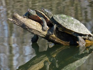 I float close enough to a wide flat turtle sunning on a log to see scarlet stripes on his face and we stare carefully at one other until he slowly slides off and I swear I can hear him sighing, yet another human has interrupted my nap.