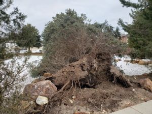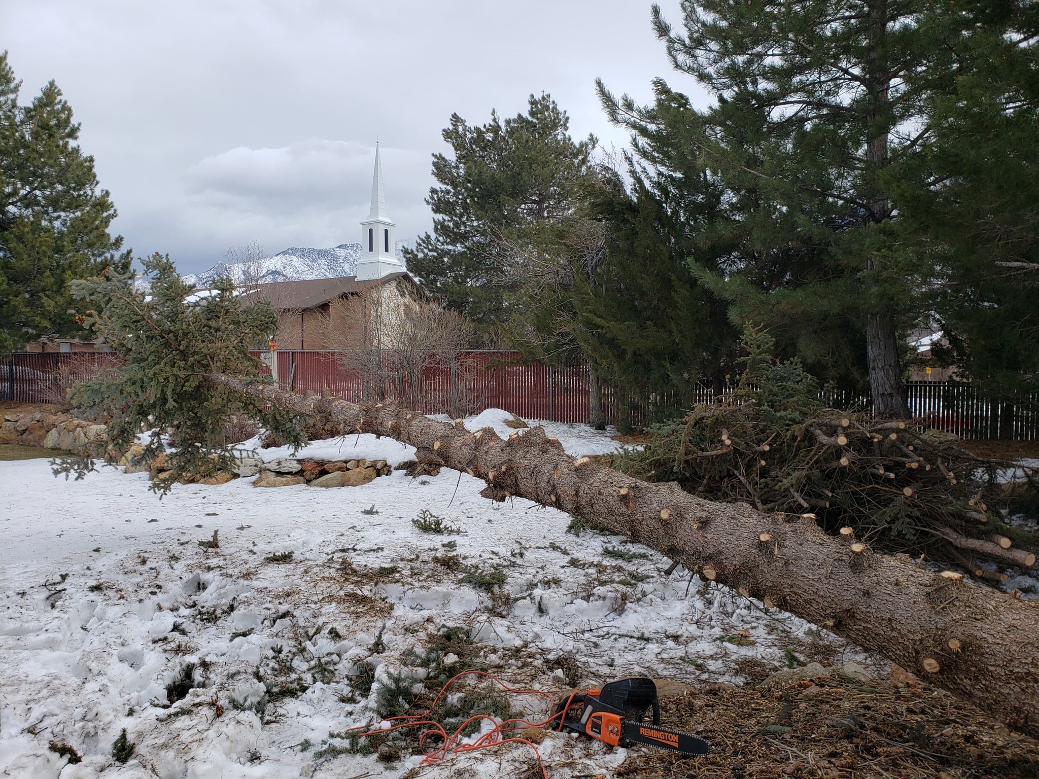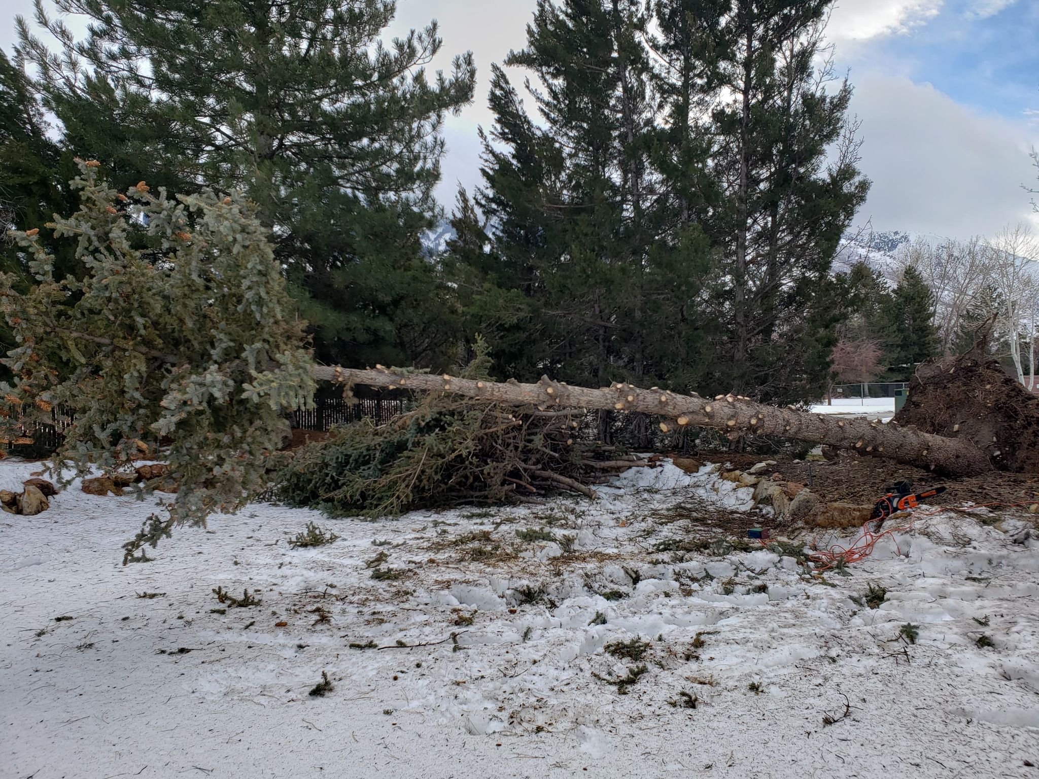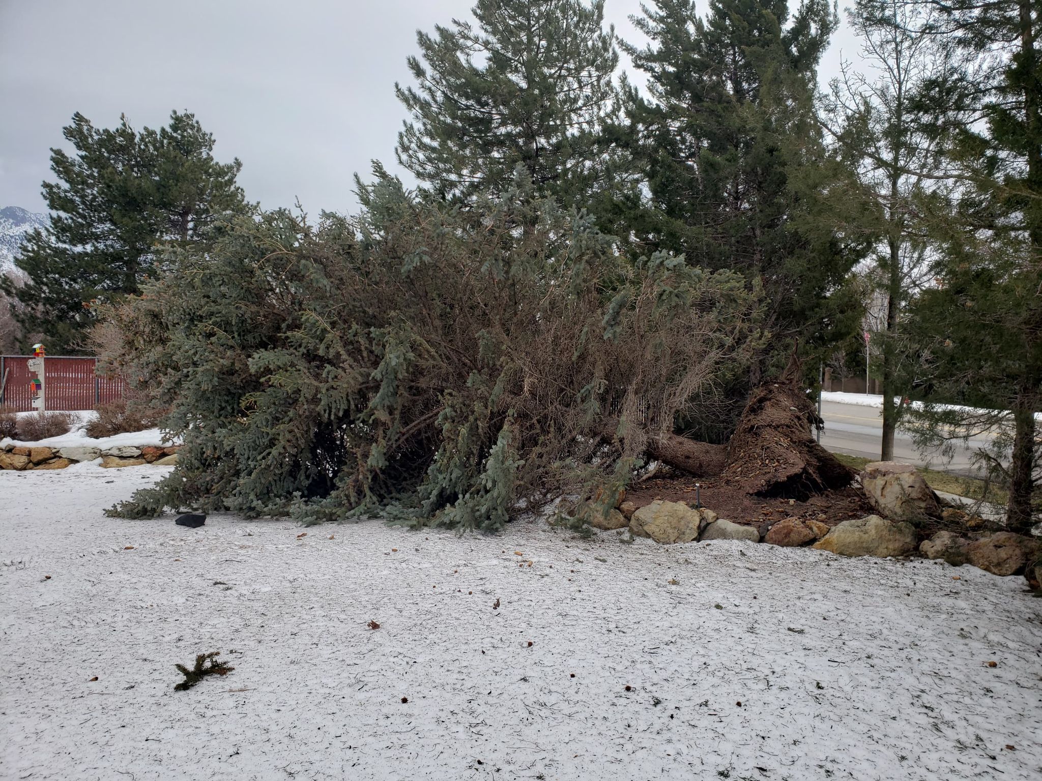 “Will I see you in the morning?” Mom asked me as I waved her a good-night. She never sees me in the morning: I leave for work before she wakes. Except for the day Stanley Steamer came to blow out and suck out all the dust and debris from the heating and air conditioning ducts. Mom arose early for when the Stanley guys came, and they came just as I was leaving. I stayed long enough to show them the furnaces and to interrogate them about their procedures for how they would prevent clouds of dust from erupting from the registers to coat the furniture and soil the newly-cleaned carpets. Their explanation satisfied me. Showing them the upstairs furnace, Dad staggered from his room and confronted them with an intimidating glare and growling, “How are you going to keep clouds of dust from erupting from all the registers and coating the furniture and soiling the carpets you cleaned just yesterday?” I got to hear the shpiel twice. Dad continued to be suspicious, but I told him I was satisfied. Mom saw me that morning. And she sees me every Friday morning because the Mayor allows me to work remotely from home on Fridays, so I can commute the two-hour round-trip to Tooele only four days a week. Today she interrupted my work with a knock at the door, handing me three business cards for tree trimmers, and informing me the giant blue spruce had blown over in the night, unable after 25 years to withstand the 65 mile-per-hour gusts tearing through the valley. Playing lumberjack was not what I wanted for today. I told her I would not call them and we would not be spending $1,000 to have the tree cut up, and that I would do it myself. Changed into my work clothes, I sized up the situation, grabbed Dad’s electric chain saw, and set to work cutting limbs off the tree. That tree was special, a big blue spruce anchoring a line of tall junipers, buffering the back yard against the noisy traffic passing day and night on the collector street. Where it had stood now gaped an unprotected gap, every driver able to gaze into our back yard, the car noise augmented. There was nothing to be done but to cut up the tree. I love trees. I even hug trees, the special ones, like the redwoods in California and the sequoias in Yosemite and the cypresses in Kentucky and the oaks and tulip trees in North Carolina and the mimosas and maples in New Jersey. I patted our fallen spruce and whispered, Good-bye, old friend, I will miss you. Starting at the base, I methodically cut each limb from the trunk, stacking them in huge piles, and with each cut I felt a twinge of sadness for the loss. I heard a knocking on the kitchen window and waved to Mom who waved to me. Half of the shallow roots had torn out when the tree fell, while the other half kept the tree suspended at a perfect height and angle for me to dissect it. With the limbs all removed, I bit the saw into the trunk and piled the logs on the park strip as free firewood. I miss my wood burning stove that stayed with the house I had to leave seven years ago. I miss the sounds of crackling wood and expanding iron, the orange glow through the glass, and the heat wafting outward with the perfumes of melting crystals of frankincense and myrrh. Unbeknownst to me, Mom was so worried about my doing the job alone that she called a neighbor lady who called her husband and told him to come help me. With his jeep and winch, he pulled the stump out of the ground, then shoveled soil back into the hole. Dad, after showing no interest in his power wheelchair for six months, suddenly insisted on riding it out the front door and down the ramps and along the sidewalk to see his friend Burke and the result of our work on the tree. The wind blew 50-degree air over the deep snow, melting it measurably before our eyes as we worked. My body aches, but the job is done, and I have said good-bye to an old friend. Will we plant new trees to fill the gap, new friends to replace the old? We must.