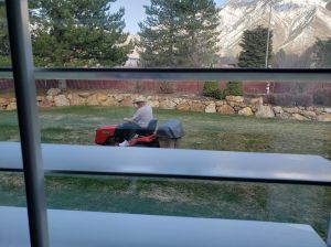 By some fluke of chaotic coincidence, light from the morning sun barely peaking over the Wasatch ridgelines glinted off the reflecting white octagonal Stop sign tape and flashed at an acute angle through the open blinds of my bedroom window and projected onto my closet doors shifting prismatic flickers, quite beautiful and striking, creating one of those moments when ask myself, not without gratitude and awe, What are the odds? and I answer, There are no odds, because that phenomenon simply should not have happened, but it did. And only I saw. Just imagine: trillions of such impossibilities happen spontaneously in nature every day somewhere on our miracle globe. I left for work and hefted throughout the day Dad’s anxiety about thatching and fertilizing the lawn before Thursday’s snow and rain, and I arrived at home with bags of crabgrass-killing fertilizer, costing an obscene $100 for a single application and stinking up my car and causing me to choke with real or imagined chemical fumes. But before I could fertilize, we needed to race the mower over the lawn, the blade set low, to suck up all the thatch and pine needles. “Dad, are you up to it?” Of course, he wasn’t. But I bundled him into his power chair anyway, after Mom rebandaged the six-inch S-curve stitched incision on the top of his head and covered the bandage with a spacious straw hat. But the hat’s brim and the chair’s headrest conflicted—will the indignities never end?—so I quickly allen-wrenched the headrest out of the way, and out the front door he went. Dad transferred from the chair to the lawn mower with great difficulty and with noisy lifting and heaving and shoving from me. This mower was not designed for 87-year-old paraplegics. With fresh gasoline, thankfully, the mower started up, and off Dad drove. Dinner would have to be made, so I rushed into the kitchen to put the meat in the oven and start the squash to steaming, listening for the moving mower and watching Dad through the open shutters of the kitchen windows as he zoomed contentedly back and forth, filling both bags with dead grass and pine needles and dust. Finished, he pulled up to the garage and killed the motor while I emptied the dusty bags. But the mower would not start again. Examining the engine, I found that one of the battery leads was corroded and encrusted, and the red wire had snapped off its lead. This mower was not going to start, though I had scraped the encrustation off and touched the wire to the lead. Nope—this mower was dead, and Dad would have to call the service center, again, to have them come pick it up. I lead the way up the ramps and into the house, frustrated at the entropy that breaks everything down, frustrated that I could not fix the mower but had bruised my knuckles trying. Dad suspiciously did not come through the front door, and, checking on him, I found him stuck where he had cut a corner too sharply and had sunk the central wheel into the mud. “I fell in a hole,” he said sheepishly with a dubious grin. I yanked the chair out, and he left a muddy trail up the ramp and through the door and across the floor to his recliner. A chop stick cleaned the treads. A broom swept up the drying dirt. And I backed the chair, which had done a fine job and was not responsible for the wreck, cautiously into its dark corner in Dad’s office.