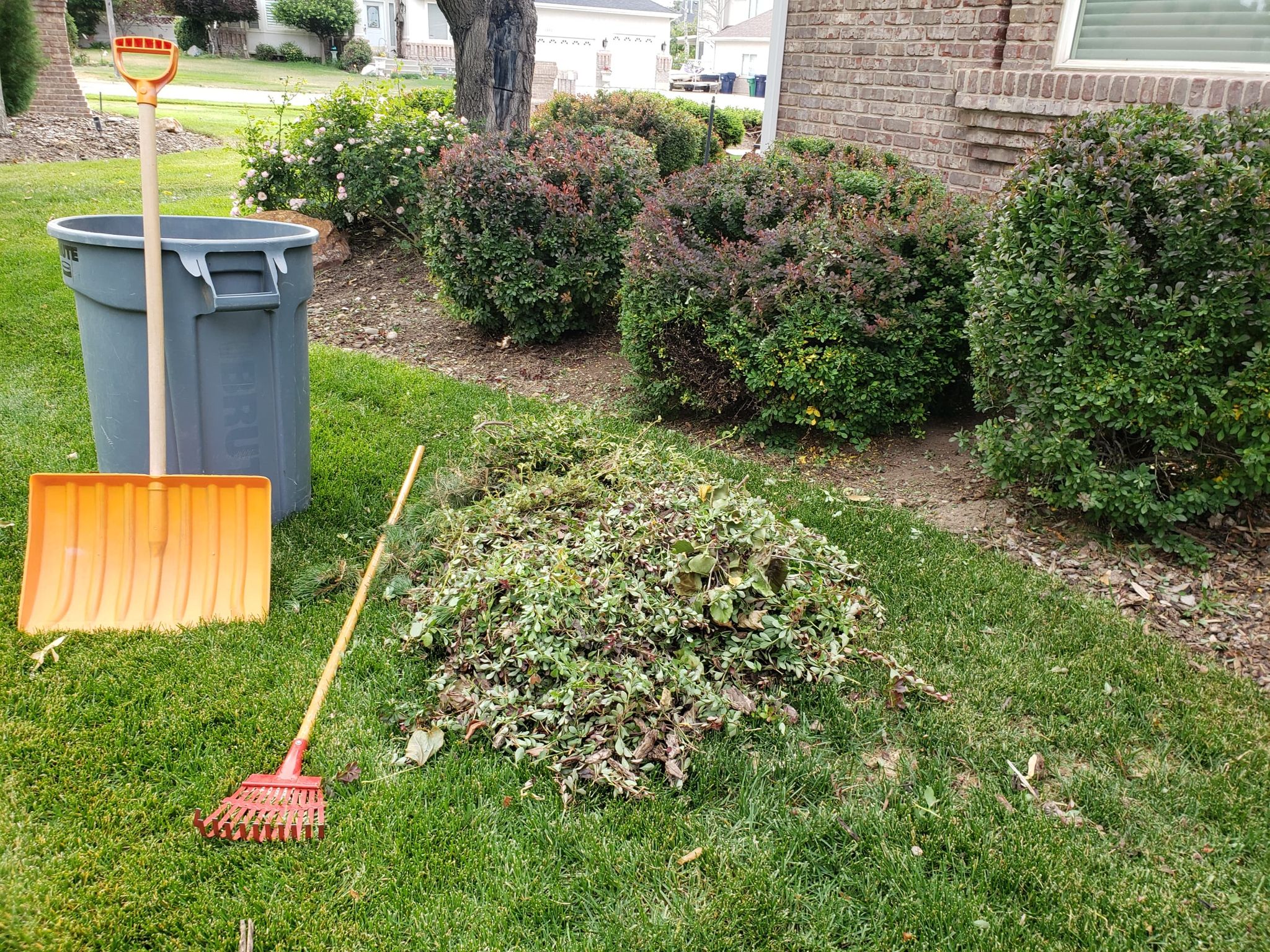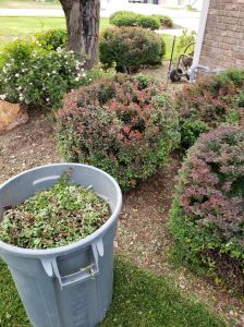 (Pictured above: a mere four hours’ effort to extirpate weeds and shape shrubs in the back yard.)