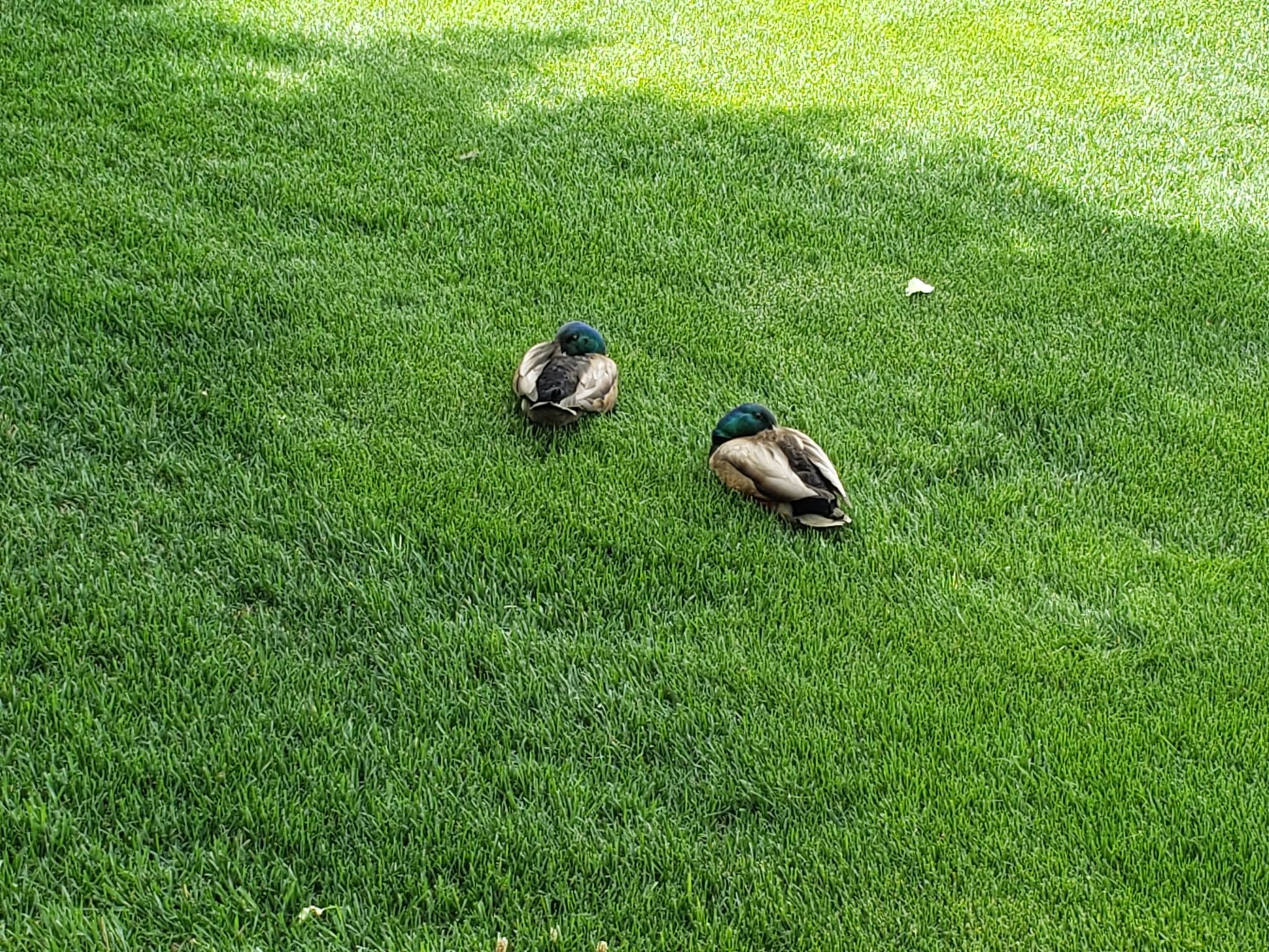 A pair of Mallard ducks dozing happily on the front lawn, waiting for the sprinklers to come on.