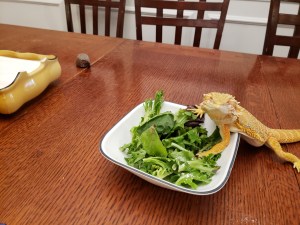 Amy came to visit her Grandma and Grandpa this week. Sunshine could not come conveniently on the plane, but Amy’s Dad drove him in his cage from Arizona to Utah several days later. When Sunshine saw Amy, he waddled quickly over to Amy and–I kid you not–gave her hand a little lick, a lick normally reserved for catching cockroaches. Though I cannot see emotion in this lizard’s features, without a doubt I saw him express enthusiastic and real affection for his human.