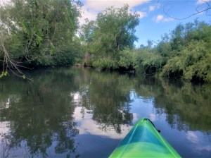 That Mr. Gander sure tricked me. He fooled me good. His antics made focusing on him irresistible. Finally yanking my attention away from the frantic papa goose, I looked back to the mama goose and goslings to see how they fared, but saw only fading ripples. They were gone, disappeared, and did not reappear while I sat and drifted, befuddled. Resuming my upstream slog, I almost failed to notice the same number of goslings of the same age and fuzziness ensconced safely behind a leafy branch hanging low over the bank, some one hundred feet from the dive: clearly the same goslings who gave me the slip while I focused on the feigning father. That gander had drawn my whole attention to him, for the sake and safety of his little ones, his progeny, and his mated partner. I had failed to understand that by slapping his wings on the water he was signaling his objection to my invasion of family space, and warning me to keep away. I had ignored his clear Goose-speak (I really need to learn Goose), and he had water-slapped away, not abandoning his family (of course), but protecting his family. I will keep my distance next time the wings beat on the water, and respect the family space. The Jordan is goose home, after all, and I am just a curious occasional uninformed rather rudely interloping human, who doesn’t know the language.