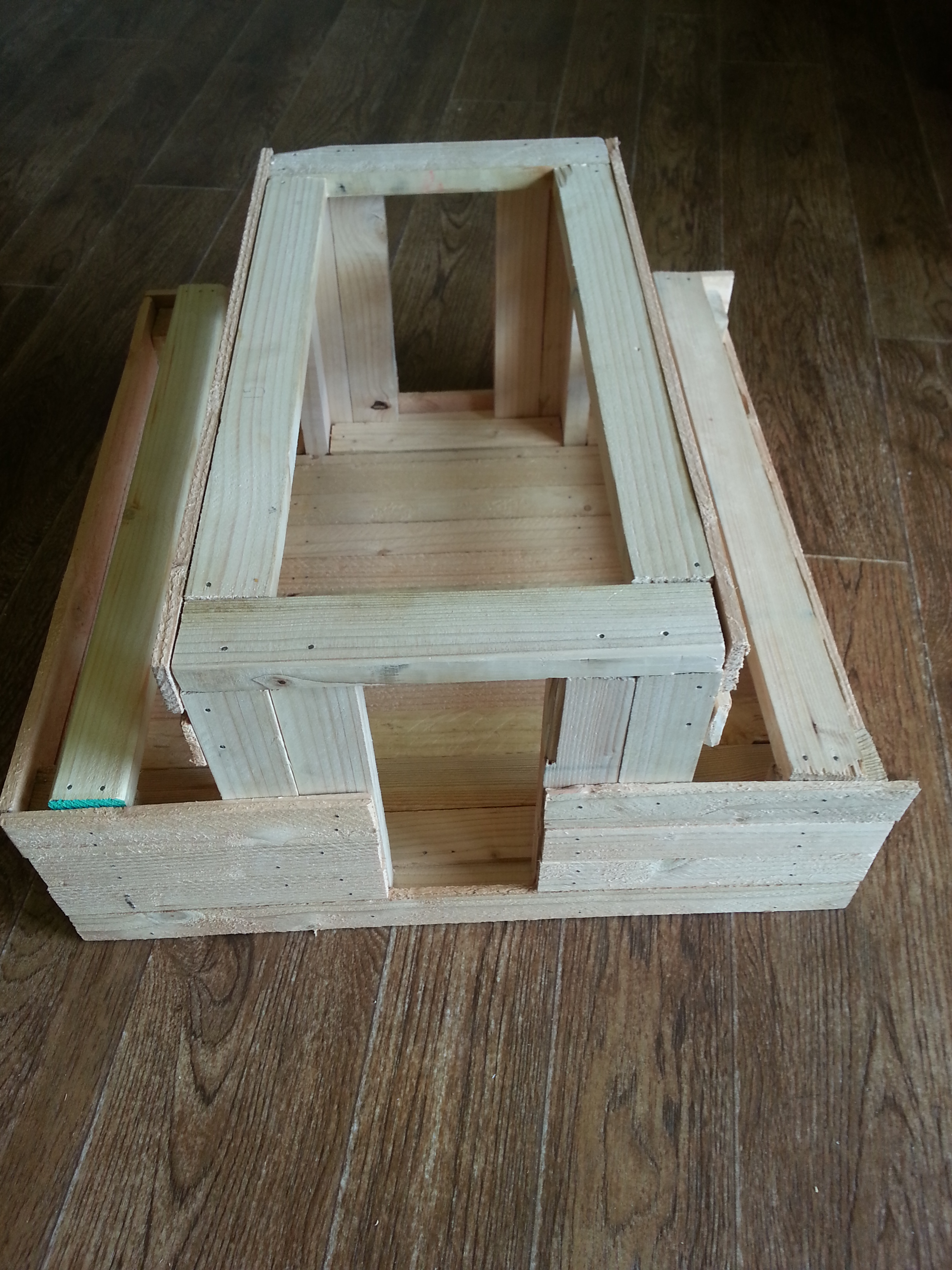 The completed frame with the interior floor installed and the wall siding begun.