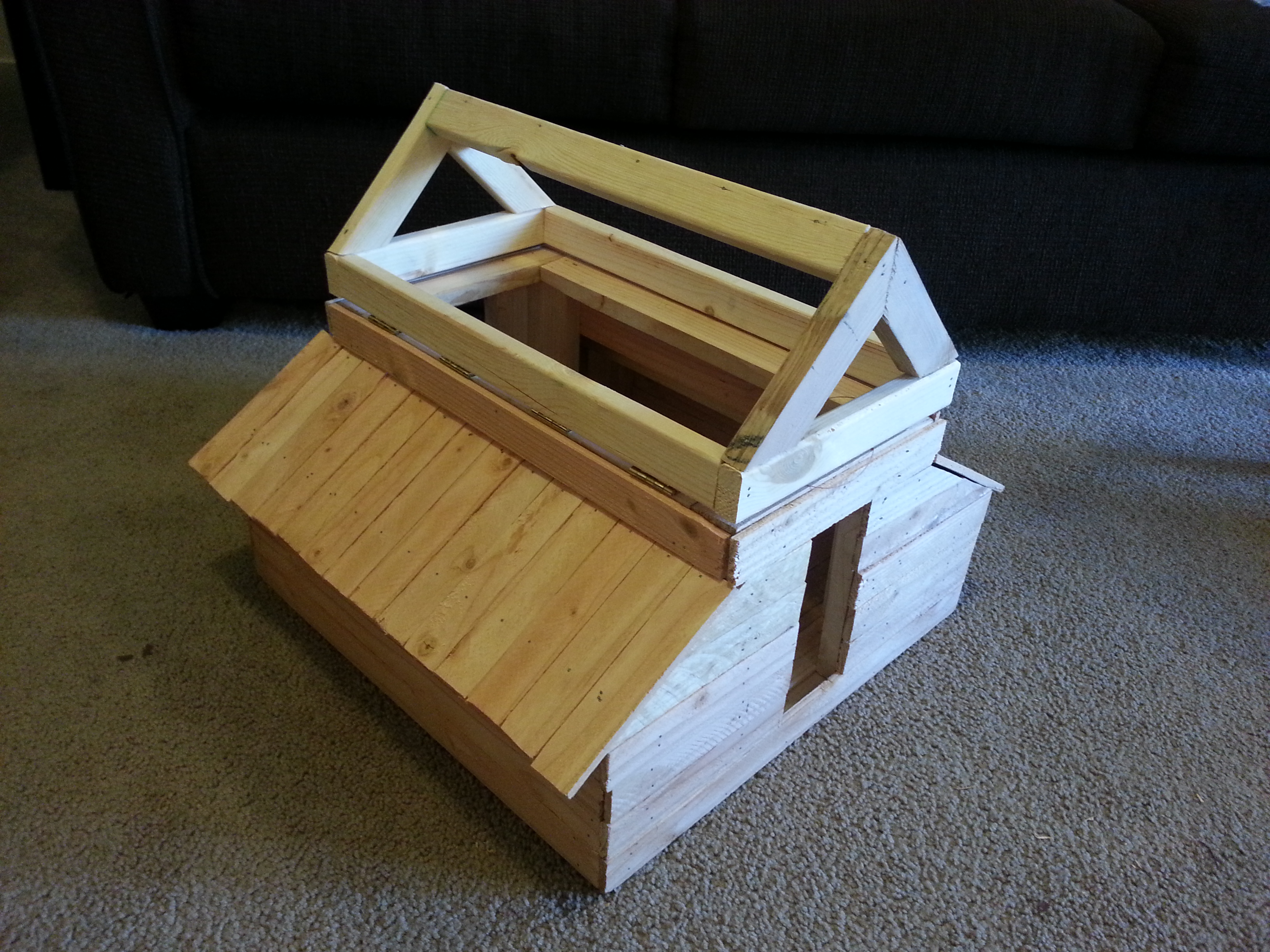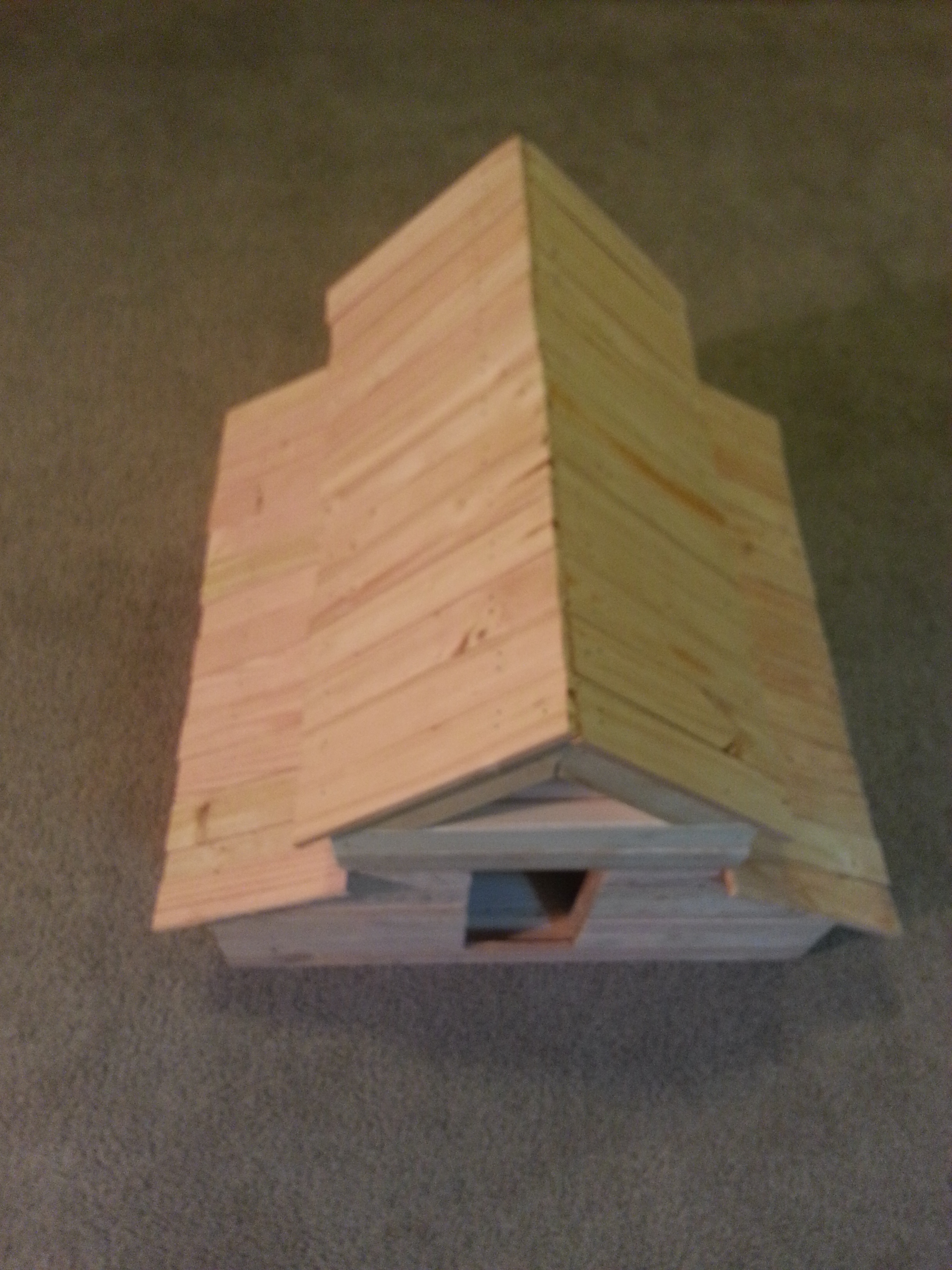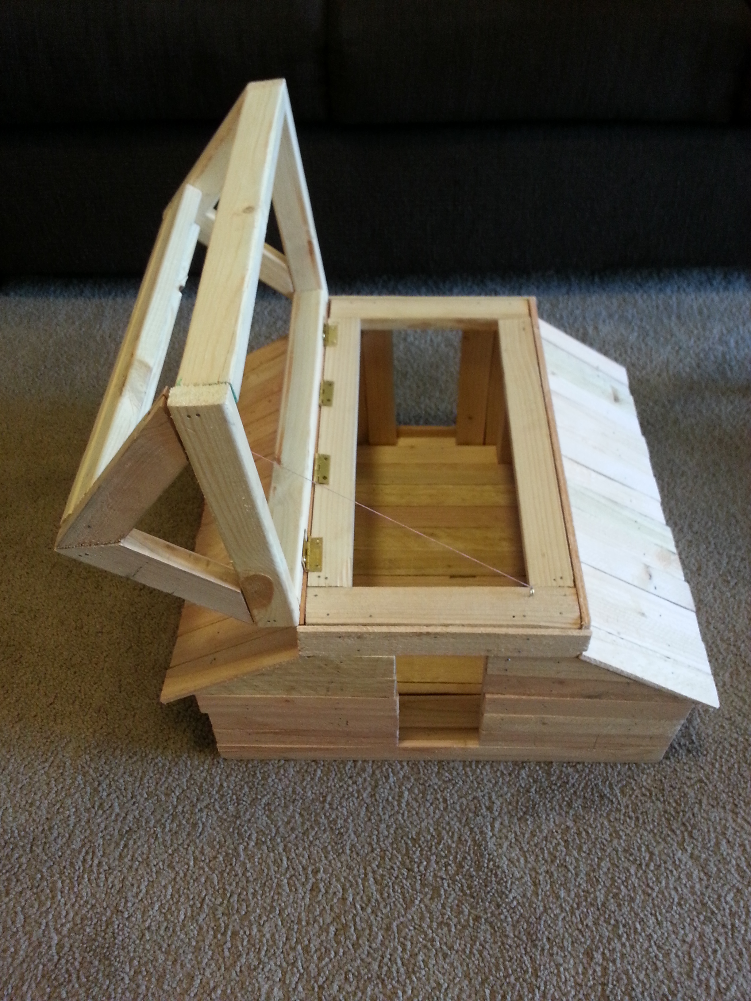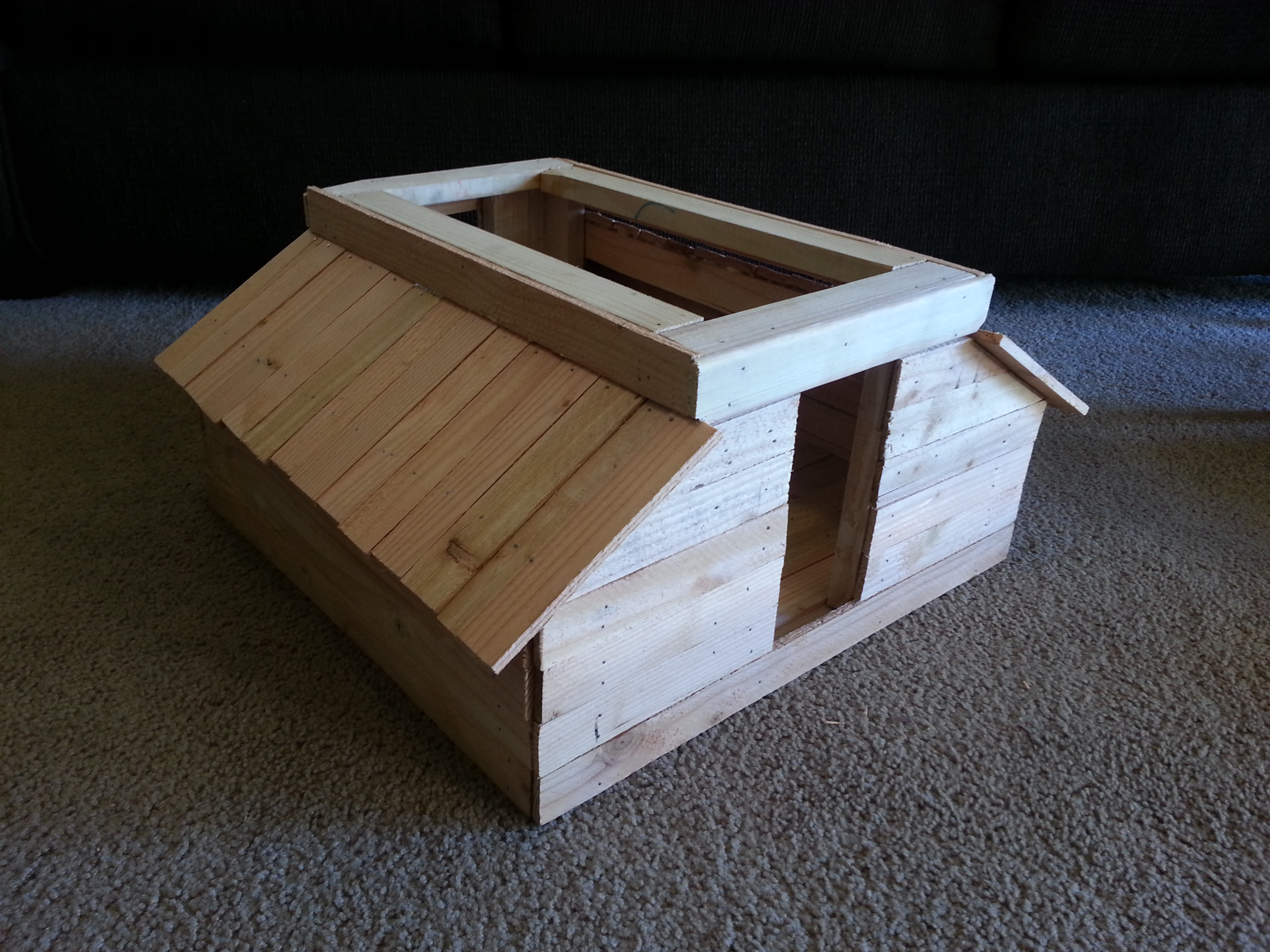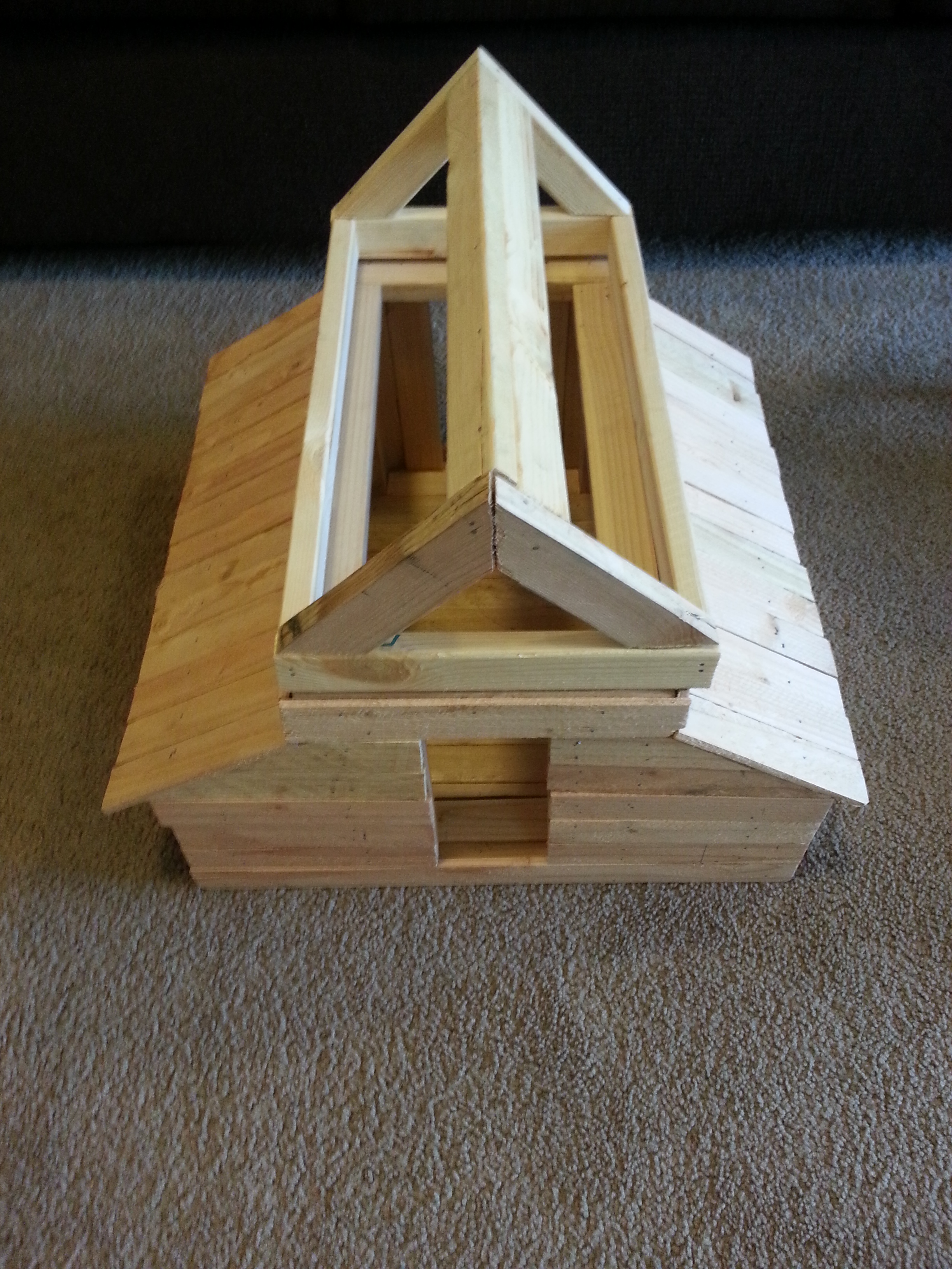 Wall siding and lean-to roofing completed with lathe. The roof frame sit, hinged, on the main barn structure.