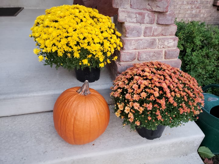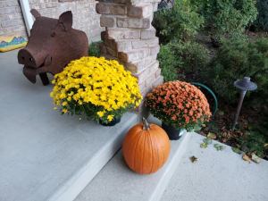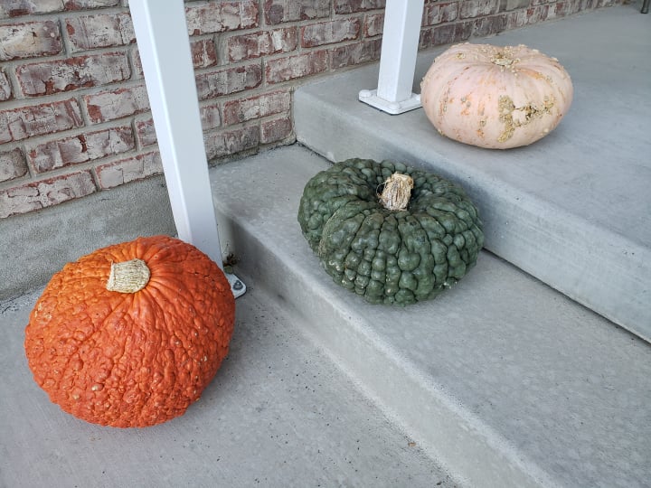 Dad suggested we bring home Café Rio for dinner. I suggested we pick up some pumpkins on the way. He protested that it was too early in the season, that they would just rot if we bought them now. I countered that if we bought them in a month they would have sat at the store for that month instead of prettily on their porch, and opined that the pumpkins would not rot until after the first hard freeze. He conceded the point. I parked at Lowes in a handicapped stall with direct line-of-sight to the pumpkin boxes, holding the pumpkins up one by one for Mom and Dad to give me the thumbs up or down for each. We left with four: traditional orange, wrinkled red, white with cream cycle splotches, and a deep green with skin lobed like a brain. At Café Rio, I stood Mom’s four-footed cane in the line. Mom and Dad sat at a table near the menu so I could explain their dinner options. The lady ahead of us moved the cane with her as the long line progressed, to keep our spot. Mom chose the roast beef burrito, and Dad the roast beef salad. Mom hinted she would like a tres leches for dessert, and Dad entreated for a key lime pie (diabetes be damned). “I’m worn out just from sitting there waiting,” Dad sighed as we walked slowly to the car. He had forgotten his cane, and so leaned on my shoulder instead. Back at home, Mom and I arranged the pumpkins festively on the front porch before settling into TexMex and Netflix.