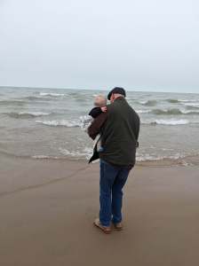 (Pictured above: Yours Truly holding my one-year-old grandson on the windy shore of Lake Michigan.)