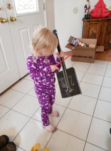 Mom’s elementary school music teacher Mr. Jeppesen hosted a music open house to which he invited all the children and their parents. One by one the teacher brought each child, including Mom, a 4th grader, to the piano where he sat. “He was an older man, shorter, kind of hunched over. He was a very good pianist, and he was very kind to me,” Mom remembered with fond appreciation. Jeppesen plunked a few notes on the piano, and asked Mom to sing them. The teacher then told Mom and her parents that she should play the violin. Her father, Wallace, agreed, and took Mom to the music store to buy a very used violin, still at considerable expense for the struggling family. Mom was a slight child, and the music store employee suggested a half-size or three-quarter-size violin. Wallace said they would take a full-size violin, which is what Mom learned to play on, and grew into. “We lived way out in the country, with no cultural advantages,” Mom explained about her joy to be playing the violin. Sometime later, when Mom needed a better violin, Wallace found her one. This is the violin she grew up with, played at the University of Utah, and took to Brazil in 1972 when she and Dad led a group of about 100 Church missionaries for three years. At the end of their mission, they packed the violin in a shipping crate with other belongings, but upon opening the crate in New Jersey, the violin was gone. The family pooled resources for Mom to purchase another violin. With that instrument, she played in several community orchestras, including Highland Park (NJ), Bound Brook (NJ), Washington Square (NJ), and Murry (UT). Covid-19 canceled rehearsals and concerts, and put an end to Mom’s public career. She pulls out her violin once in a while, like during the Christmas holiday. My granddaughter’s parents suggested Lila might like a violin, so I made one for her out of a cracker box, a yard stick, packing tape, spray paint, thumb tacks, and string. And she loved it. Pretending to stroke her strings with a red soda straw, Lila stood entranced as Mom played her real violin to her little great-granddaughter. Mom just may have inspired another generation of Baker violinists.