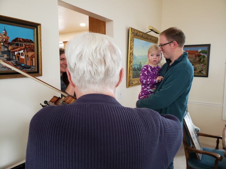 To prepare for the musical program at our church’s Christmas services, Mom’s friend Tamara organized a church orchestra from neighborhood musicians. Mom has played the violin since elementary school, and plays still. She played in the Murray Symphony, a community orchestra, until age 80, when Covid-19 ended all rehearsals and performances for a year and a half. The family loved supporting her at concerts, cheering and taking photographs. At age 82, Mom has decided the rehearsal schedule, the walking, the sitting, and the ornery conductor are just too hard, and she resigned from the symphony. But she is thrilled to be part of the church Christmas orchestra. Tamara and her husband Mike pick her up for rehearsal every Sunday afternoon at 3:30. “They are just so nice,” Mom reported. Tamara delivers Mom the music she needs, and looks carefully after her. Mike helps her walk to and from the car, and carries her violin. I am so happy for Mom to be playing her violin again in an orchestra, and to exchange greetings and rub shoulders with people she loves. And I am so grateful for kind people in the world who make all the difference, as Mike and Tamara are doing for my cute, sweet, 82-year-old musician mother.