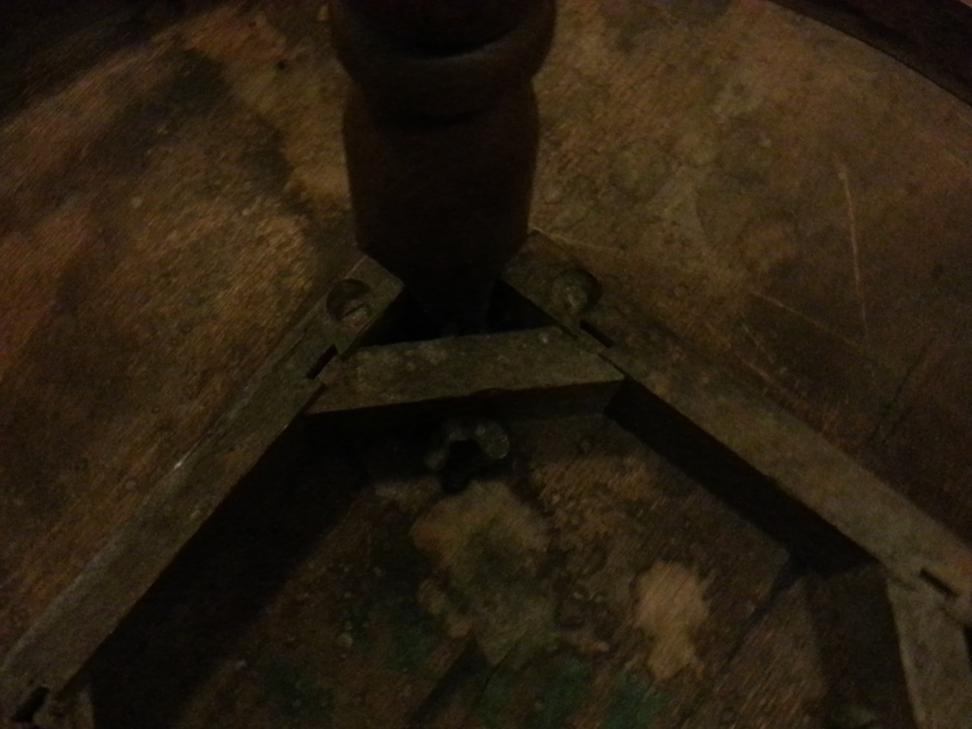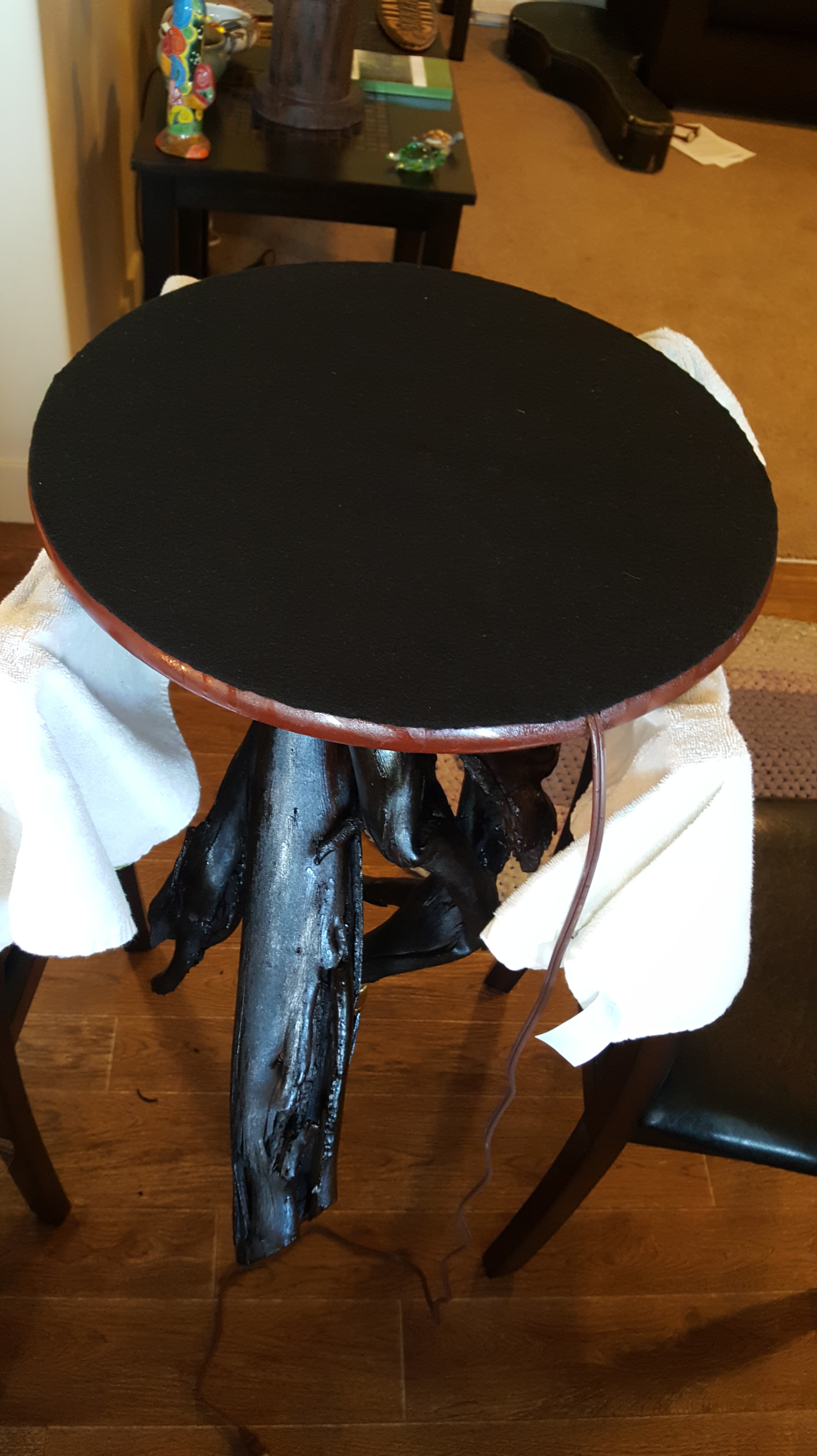 With the lamp stained once, we were prepared to mount it to its base. I learned the hard way on another tall lamp that a single bolt leaves the lamp wobbly, no matter how tight. So we used two bolts, ratcheting the nuts down hard, with large washers on both ends, and with a little lock nut to keep them tight. Black caulk filled the holes and covered the bolt heads. We drilled and routed the base to accommodate the electrical chord.